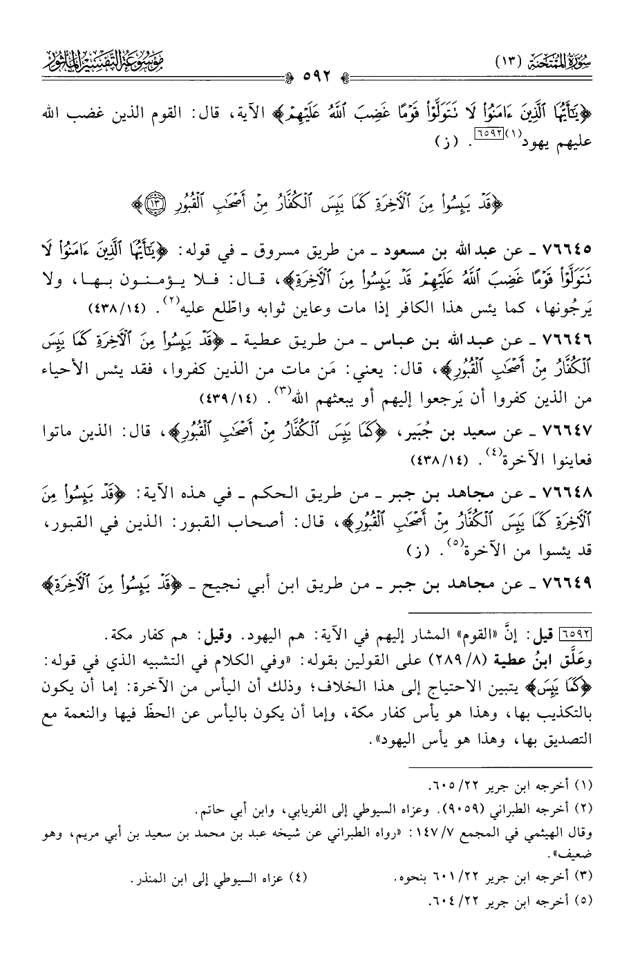 ٧٦٦٤٥ - عن عبد الله بن مسعود -من طريق مسروق- في قوله: {يا أيُّها الَّذِينَ آمَنُوا لا تَتَوَلَّوْا قَوْمًا غَضِبَ اللَّهُ عَلَيْهِمْ قَدْ يَئِسُوا مِنَ الآخِرَةِ}، قال: فلا يؤمنون بها، ولا يَرجُونها، كما يئس هذا الكافر إذا مات وعاين ثوابه واطّلع عليه (¬٢). (١٤/ ٤٣٨)