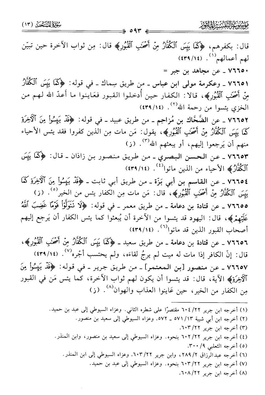 ٧٦٦٥٦ - عن قتادة بن دعامة -من طريق سعيد- {كَما يَئِسَ الكُفّارُ مِن أصْحابِ القُبُورِ}، قال: إنّ الكافر إذا مات له ميت لم يرجُ لقاءَه، ولم يحتسب أجْره (¬٧). (١٤/ ٤٣٩)