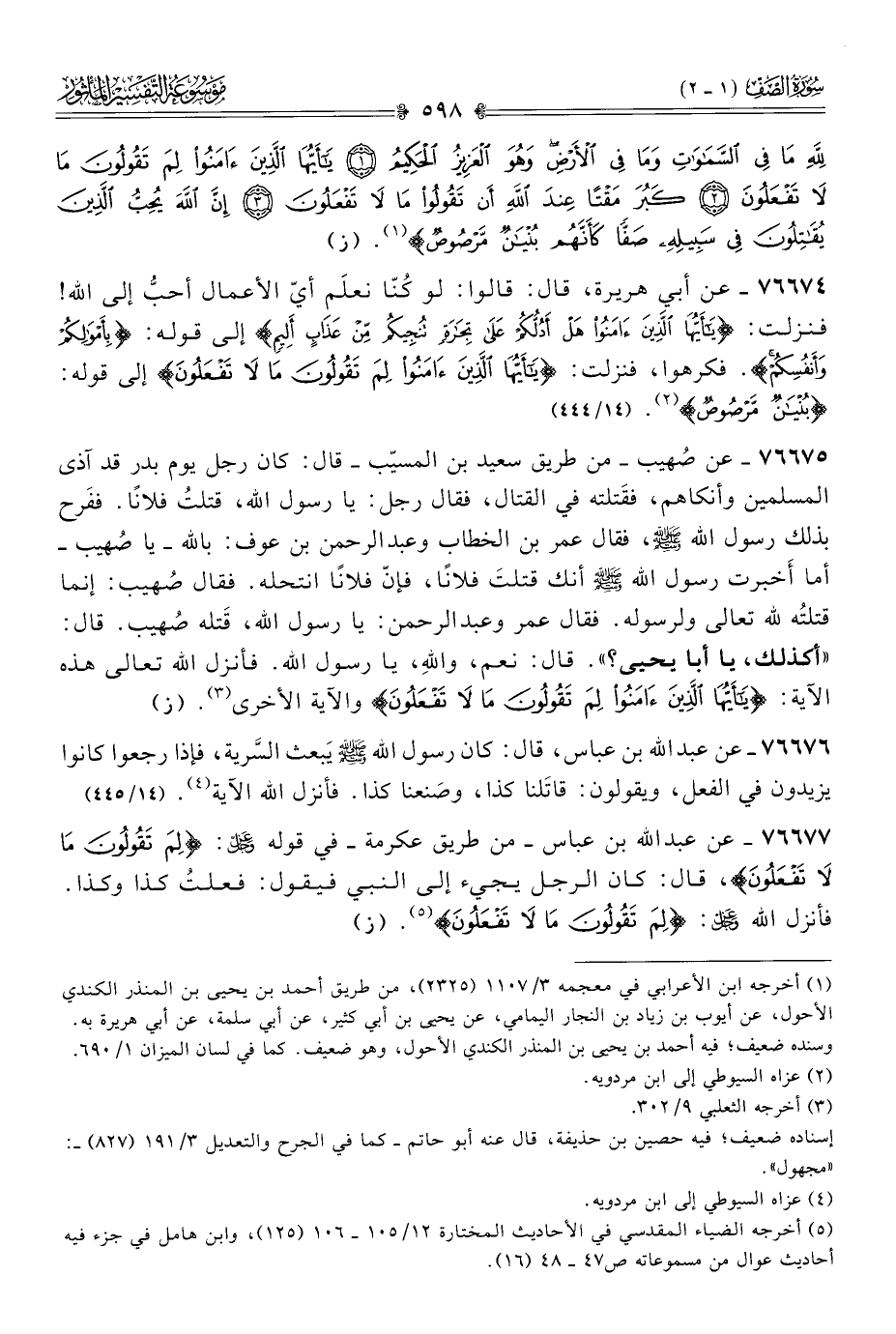 ٧٦٦٧٥ - عن صُهيب -من طريق سعيد بن المسيّب- قال: كان رجل يوم بدر قد آذى المسلمين وأنكاهم، فقَتلته في القتال، فقال رجل: يا رسول الله، قتلتُ فلانًا. ففَرح بذلك رسول الله - صلى الله عليه وسلم -، فقال عمرو بن الخطاب وعبد الرحمن بن عوف: بالله -يا صُهيب- أما أخبرت رسول الله - صلى الله عليه وسلم - أنك قتلتَ فلانًا، فإنّ فلانًا انتحله. فقال صُهيب: إنما قتلتُه لله تعالى ولرسوله. فقال عمر وعبد الرحمن: يا رسول الله، قَتله صُهيب. قال: «أكذلك، يا أبا يحيى؟». قال: نعم، واللهِ، يا رسول الله. فأنزل الله تعالى هذه الآية: {يا أيُّها الَّذِينَ آمَنُوا لِمَ تَقُولُونَ ما لا تَفْعَلُونَ} والآية الأخرى (¬٣). (ز)