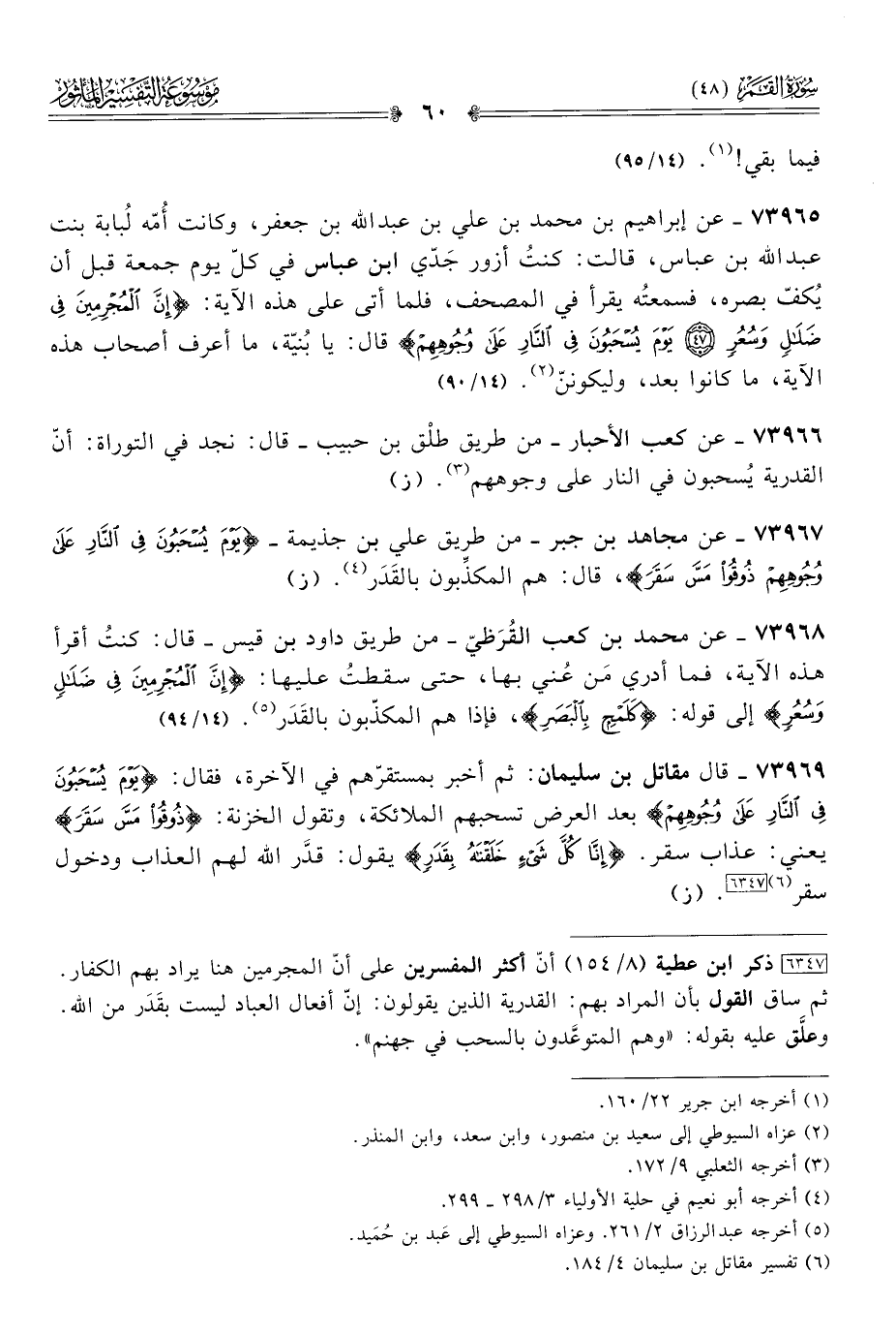 ٧٣٩٦٧ - عن مجاهد بن جبير -من طريق علي بن جذيمة- {يوم يسحبون في النار على وجوههم ذوقوا مس سقر}، قال: هم المكذِّبون بالقَدَر (¬٤). (ز)