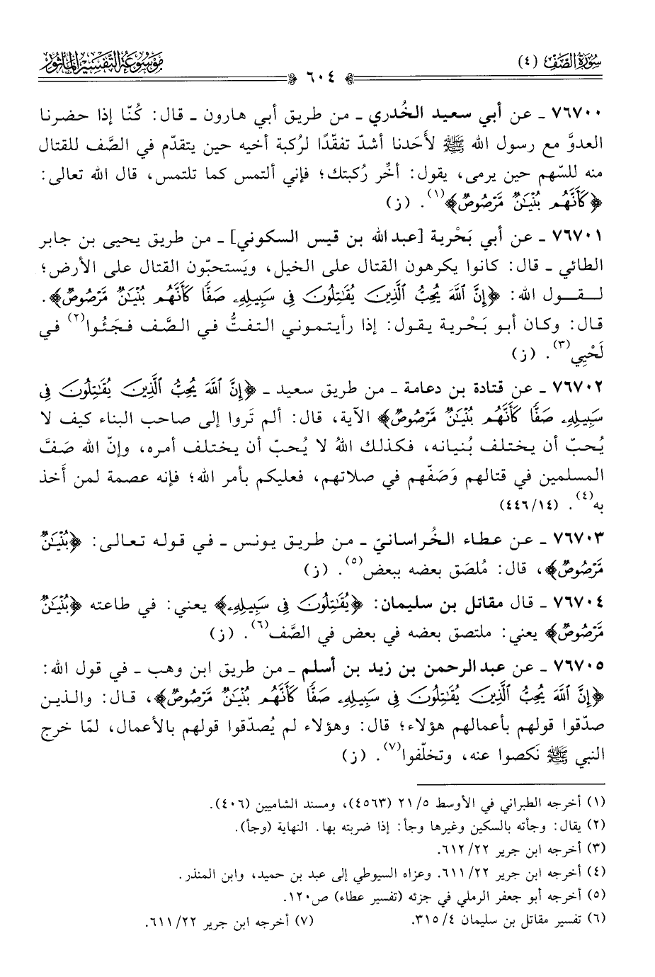 ٧٦٧٠٥ - عن عبد الرحمن بن زيد بن أسلم -من طريق ابن وهب- في قول الله: {إنَّ اللَّهَ يُحِبُّ الَّذِينَ يُقاتِلُونَ فِي سَبِيلِهِ صَفًّا كَأَنَّهُمْ بُنْيانٌ مَرْصُوصٌ}، قال: والذين صدّقوا قولهم بأعمالهم هؤلاء؛ قال: وهؤلاء لم يُصدّقوا قولهم بالأعمال، لمّا خرج النبي - صلى الله عليه وسلم - نَكصوا عنه، وتخلّفوا (¬٧). (ز)