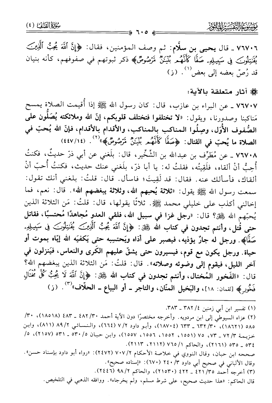 ٧٦٧٠٨ - عن مُطَرِّف بن عبد الله بن الشِّخِّير، قال: بلَغني عن أبي ذرّ حديثٌ، فكنتُ أُحِبُّ أنْ ألقاه، فلَقِيتُه، فقلتُ له: يا أبا ذرّ، بلَغني عنك حديث، فكنتُ أُحبّ أنْ ألقاك، فأسألك عنه. فقال: قد لَقِيتَ؛ فاسأل. قال: قلتُ: بلغني أنك تقول: سمعت رسول الله - صلى الله عليه وسلم - يقول: «ثلاثة يُحبهم الله، وثلاثة يبغضهم الله». قال: نعم، فما إخالني أكذب على خليلي محمد - صلى الله عليه وسلم -. ثلاثًا يقولها، قال: قلتُ: مَن الثلاثة الذين يُحبّهم الله - عز وجل -؟ قال: «رجل غزا في سبيل الله، فلقي العدو مُجاهدًا مُحتسبًا، فقاتل حتى قُتل، وأنتم تجدون في كتاب الله - عز وجل -: {إنَّ اللَّهَ يُحِبُّ الَّذِينَ يُقاتِلُونَ فِي سَبِيلِهِ صَفًّا}. ورجل له جارٌ يؤذيه، فيصبر على أذاه ويَحتسِبه حتى يَكفيَه الله إيّاه بموت أو حياة. ورجل يكون مع قوم، فيسيرون حتى يشقّ عليهم الكَرى والنعاس، فيَنزلون في آخر الليل، فيقوم إلى وضوئه وصلاته». قال: قلتُ: مَن الثلاثة الذين يبغضهم الله؟ قال: «الفَخور المُختال، وأنتم تجدون في كتاب الله - عز وجل -: {إن الله لا يحب كل مختال فخور} [لقمان: ١٨]، والبَخيل المنّان، والتاجر -أو البياع- الحلّاف» (¬٣). (ز)