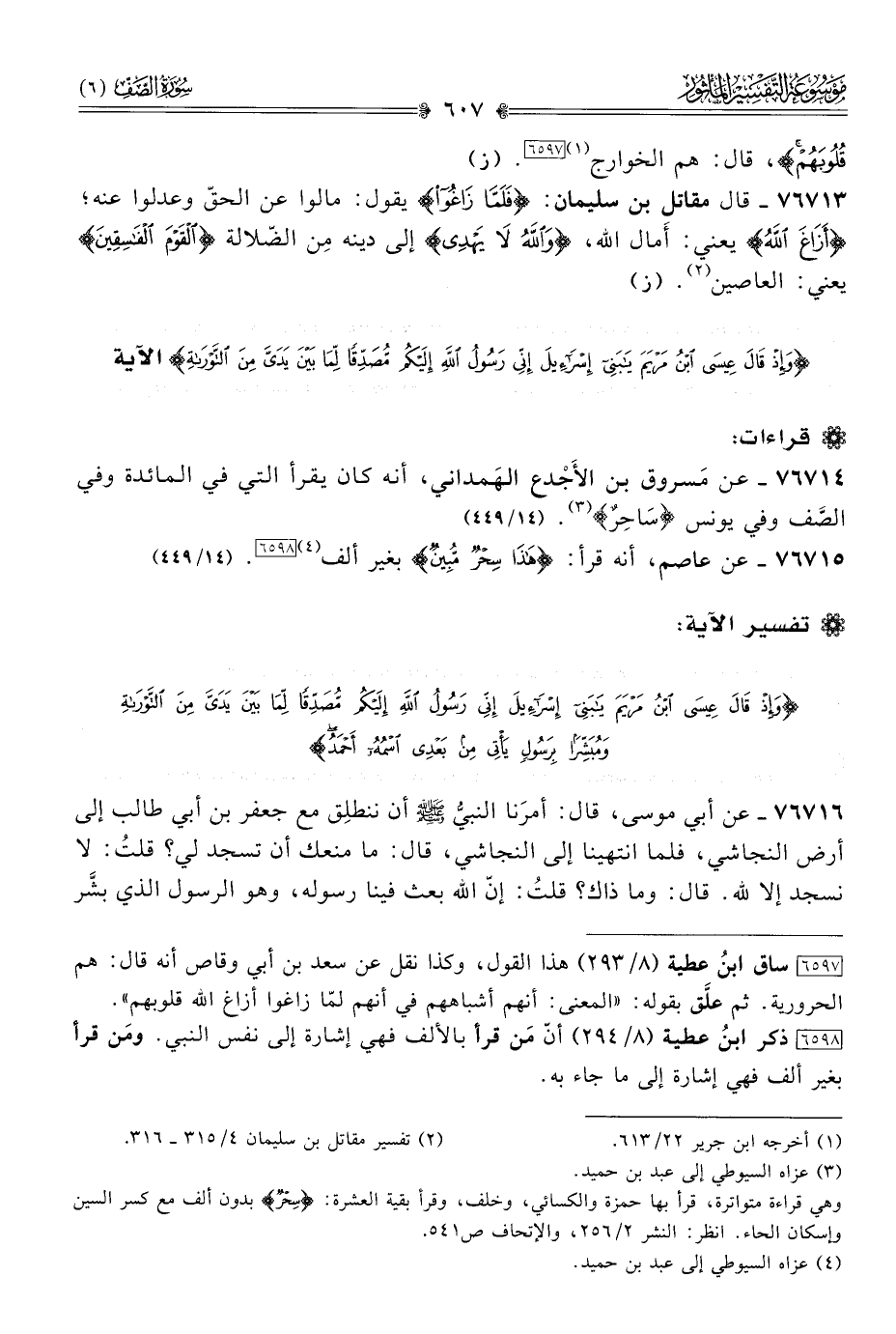٧٦٧١٤ - عن مَسروق بن الأَجْدع الهَمداني، أنه كان يقرأ التي في المائدة وفي الصَّف وفي يونس «ساحِرٌ» (¬٣). (١٤/ ٤٤٩)