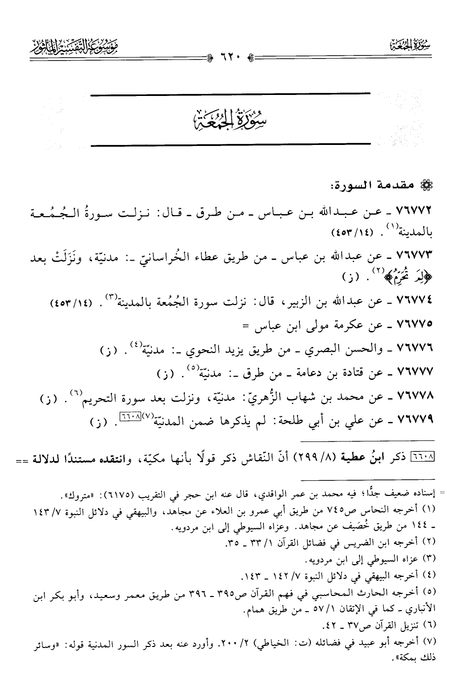 ٧٦٧٧٢ - عن عبد الله بن عباس -من طرق- قال: نزلت سورةُ الجُمُعة بالمدينة (¬١). (١٤/ ٤٥٣)