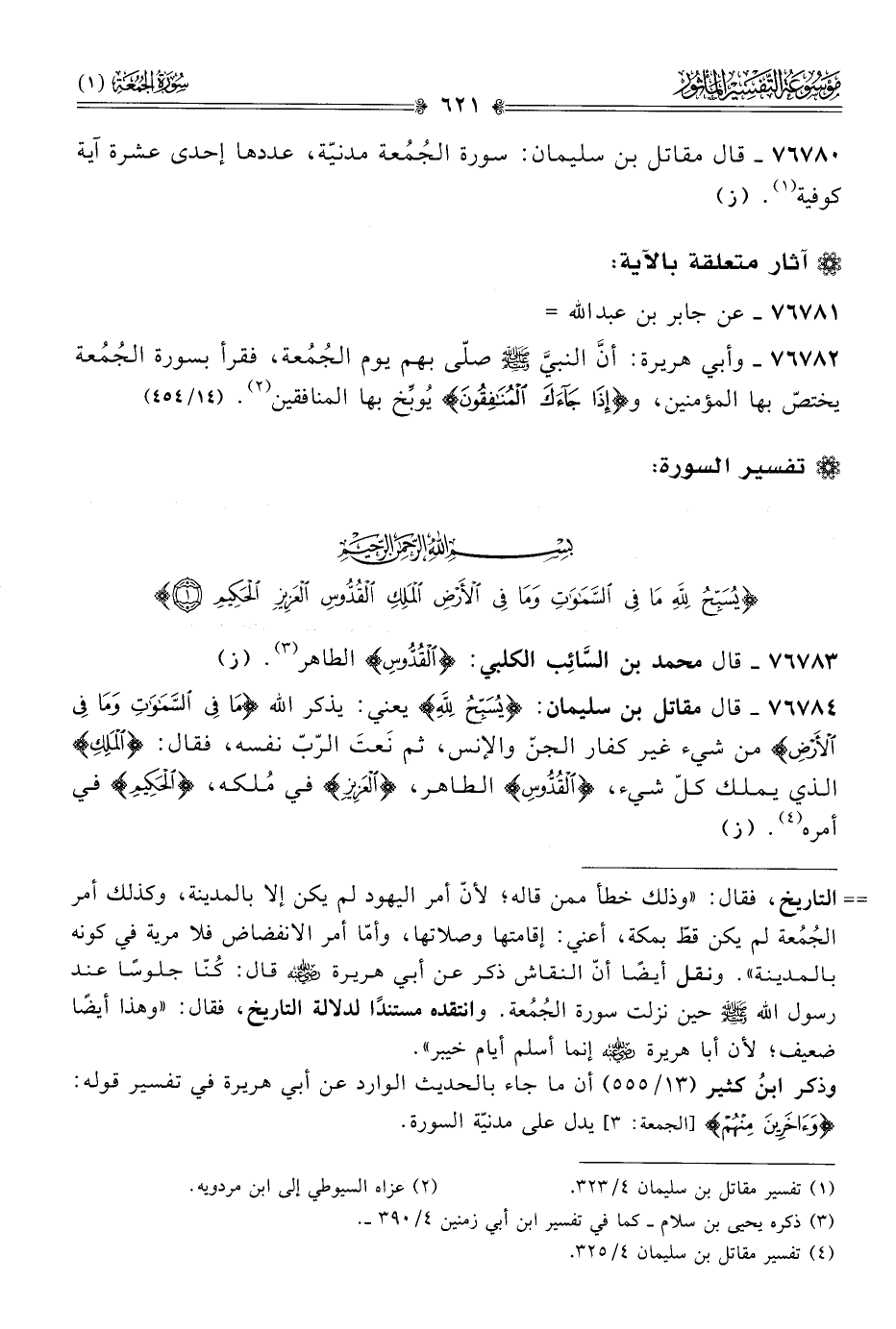 ٧٦٧٨٠ - قال مقاتل بن سليمان: سورة الجُمُعة مدنيّة، عددها إحدى عشرة آية كوفية (¬١). (ز)