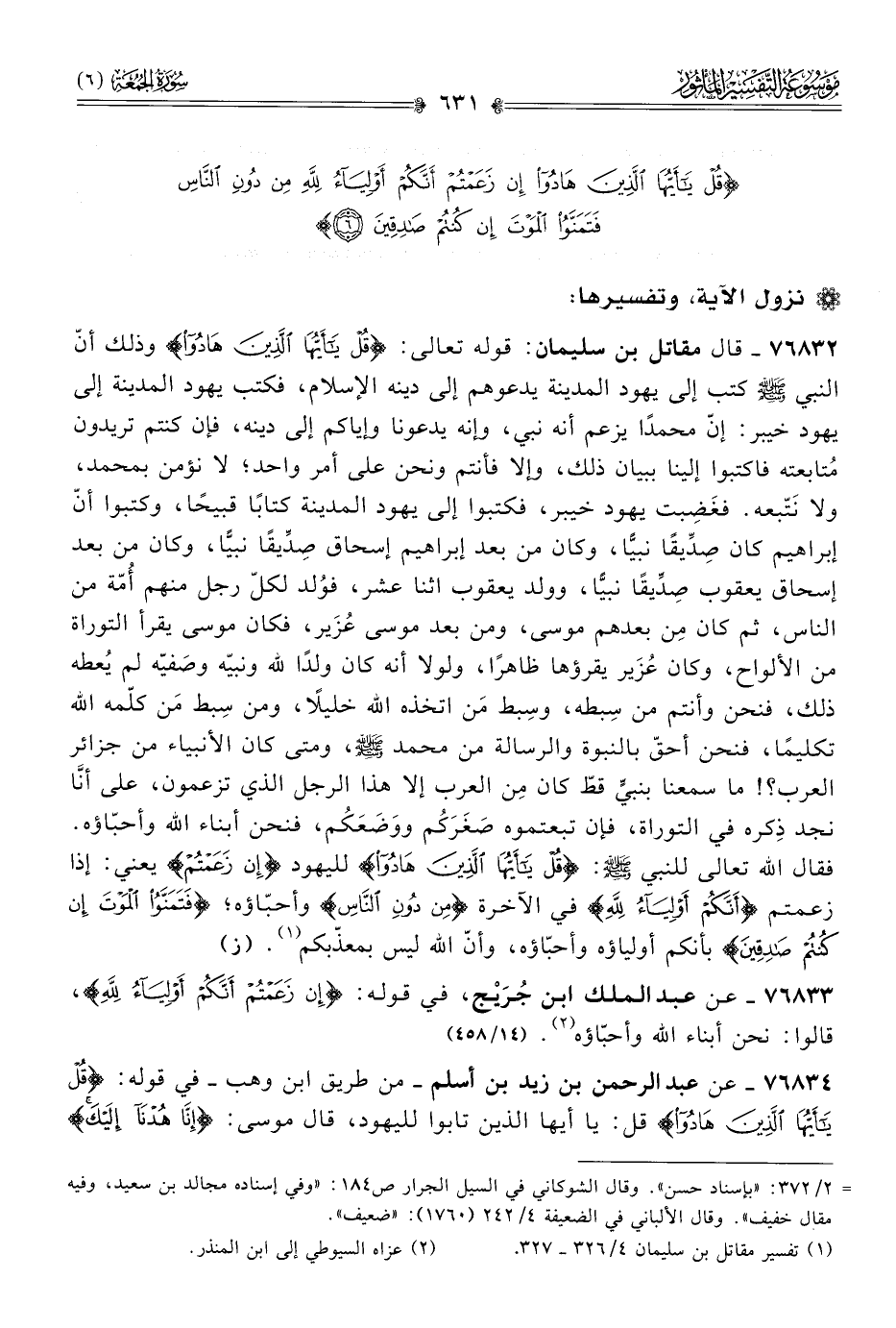 ٧٦٨٣٢ - قال مقاتل بن سليمان: قوله تعالى: {قُلْ يا أيُّها الَّذِينَ هادُوا} وذلك أنّ النبي - صلى الله عليه وسلم - كتب إلى يهود المدينة يدعوهم إلى دينه الإسلام، فكتب يهود المدينة إلى يهود خيبر: إنّ محمدًا يزعم أنه نبي، وإنه يدعونا وإياكم إلى دينه، فإن كنتم تريدون مُتابعته فاكتبوا إلينا ببيان ذلك، وإلا فأنتم ونحن على أمر واحد؛ لا نؤمن بمحمد، ولا نَتّبعه. فغَضِبت يهود خيبر، فكتبوا إلى يهود المدينة كتابًا قبيحًا، وكتبوا أنّ إبراهيم كان صِدِّيقًا نبيًّا، وكان من بعد إبراهيم إسحاق صِدِّيقًا نبيًّا، وكان من بعد إسحاق يعقوب صِدِّيقًا نبيًّا، وولد يعقوب اثنا عشر، فوُلد لكلّ رجل منهم أُمّة من الناس، ثم كان مِن بعدهم موسى، ومن بعد موسى عُزَير، فكان موسى يقرأ التوراة من الألواح، وكان عُزَير يقرؤها ظاهرًا، ولولا أنه كان ولدًا لله ونبيّه وصَفيّه لم يُعطه ذلك، فنحن وأنتم من سِبطه، وسِبط مَن اتخذه الله خليلًا، ومن سِبط مَن كلّمه الله تكليمًا، فنحن أحقّ بالنبوة والرسالة من محمد - صلى الله عليه وسلم -، ومتى كان الأنبياء من جزائر العرب؟! ما سمعنا بنبيٍّ قطّ كان مِن العرب إلا هذا الرجل الذي تزعمون، على أنّا نجد ذِكره في التوراة، فإن تبعتموه صَغَرَكُم ووَضَعَكُم، فنحن أبناء الله وأحبّاؤه. فقال الله تعالى للنبي - صلى الله عليه وسلم -: {قُلْ يا أيُّها الَّذِينَ هادُوا} لليهود {إنْ زَعَمْتُمْ} يعني: إذا زعمتم {أنَّكُمْ أوْلِياءُ لِلَّهِ} في الآخرة {مِن دُونِ النّاسِ} وأحبّاؤه؛ {فَتَمَنَّوُا المَوْتَ إنْ كُنْتُمْ صادِقِينَ} بأنكم أولياؤه وأحبّاؤه، وأنّ الله ليس بمعذّبكم (¬١). (ز)