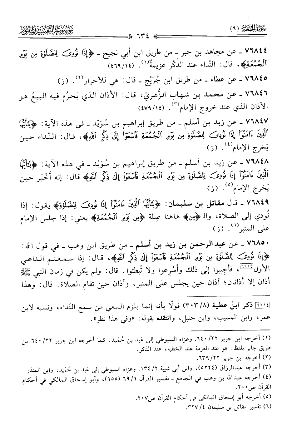 ٧٦٨٤٤ - عن مجاهد بن جبر -من طريق ابن أبي نجيح- {إذا نُودِيَ لِلصَّلاةِ مِن يَوْمِ الجُمُعَةِ}، قال: النّداء عند الذِّكْر عزيمةٌ (¬١). (١٤/ ٤٦٩)