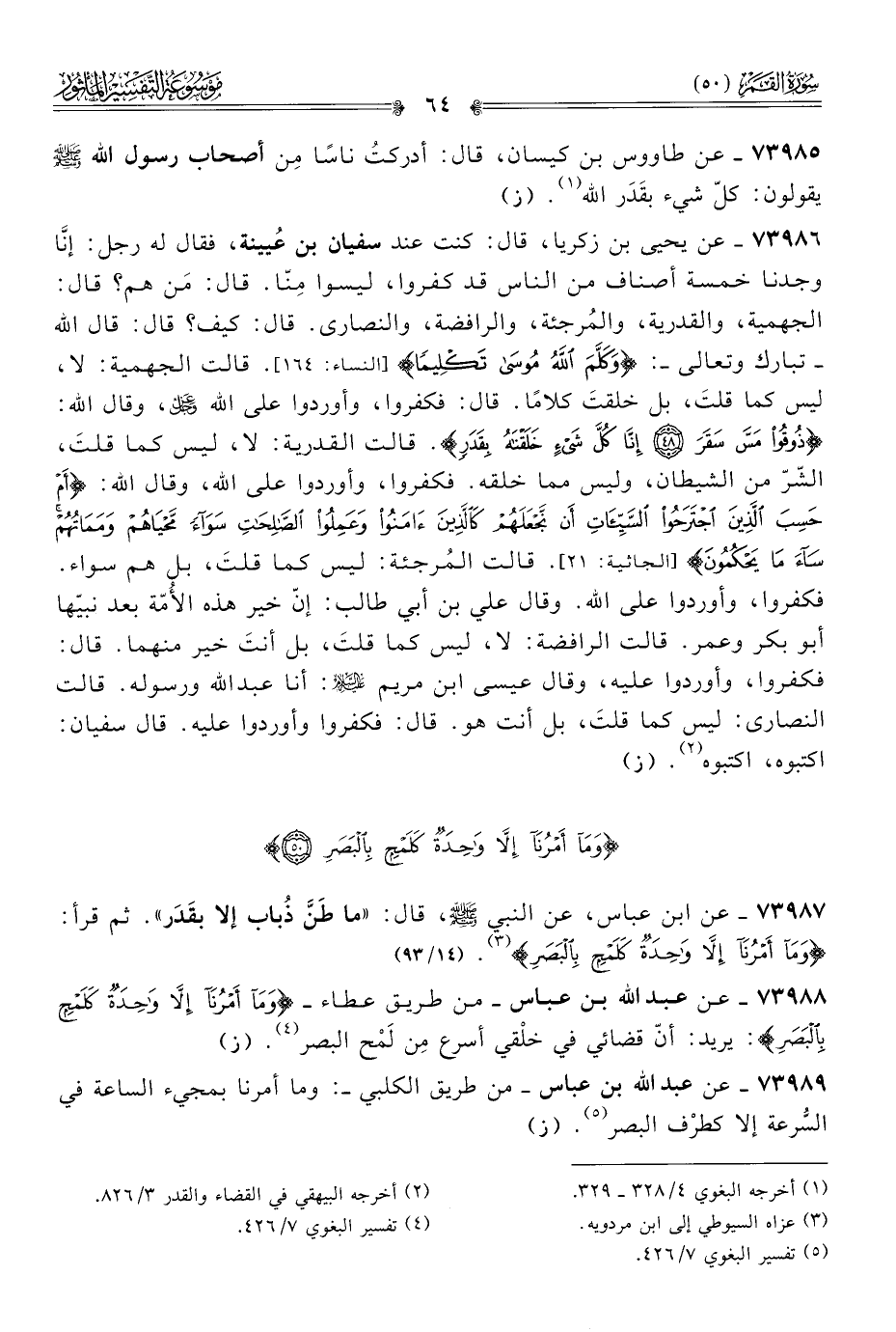 ٧٣٩٨٦ - عن يحيى بن زكريا، قال: كنت عند سفيان بن عُيينة، فقال له رجل: إنّا وجدنا خمسة أصناف من الناس قد كفروا، ليسوا مِنّا. قال: مَن هم؟ قال: الجهمية، والقدرية، والمُرجئة، والرافضة، والنصارى. قال: كيف؟ قال: قال الله -تبارك وتعالى-: {وكلم الله موسى تكليما} [النساء: ١٦٤]. قالت الجهمية: لا، ليس كما قلتَ، بل خلقتَ كلامًا. قال: فكفروا، وأوردوا على الله - عز وجل -، وقال الله: {ذوقوا مس سقر إنا كل شيء خلقناه بقدر}. قالت القدرية: لا، ليس كما قلتَ، الشّرّ من الشيطان، وليس مما خلقه. فكفروا، وأوردوا على الله، وقال الله: {أم حسب الذين اجترحوا السيئات أن نجعلهم كالذين آمنوا وعملوا الصالحات سواء محياهم ومماتهم ساء ما يحكمون} [الجاثية: ٢١]. قالت المُرجئة: ليس كما قلتَ، بل هم سواء. فكفروا، وأوردوا على الله. وقال علي بن أبي طالب: إنّ خير هذه الأُمّة بعد نبيّها أبو بكر وعمر. قالت الرافضة: لا، ليس كما قلتَ، بل أنتَ خير منهما. قال: فكفروا، وأوردوا عليه، وقال عيسى ابن مريم - عليه السلام -: أنا عبد الله ورسوله. قالت النصارى: ليس كما قلتَ، بل أنت هو. قال: فكفروا وأوردوا عليه. قال سفيان: اكتبوه، اكتبوه (¬٢). (ز)