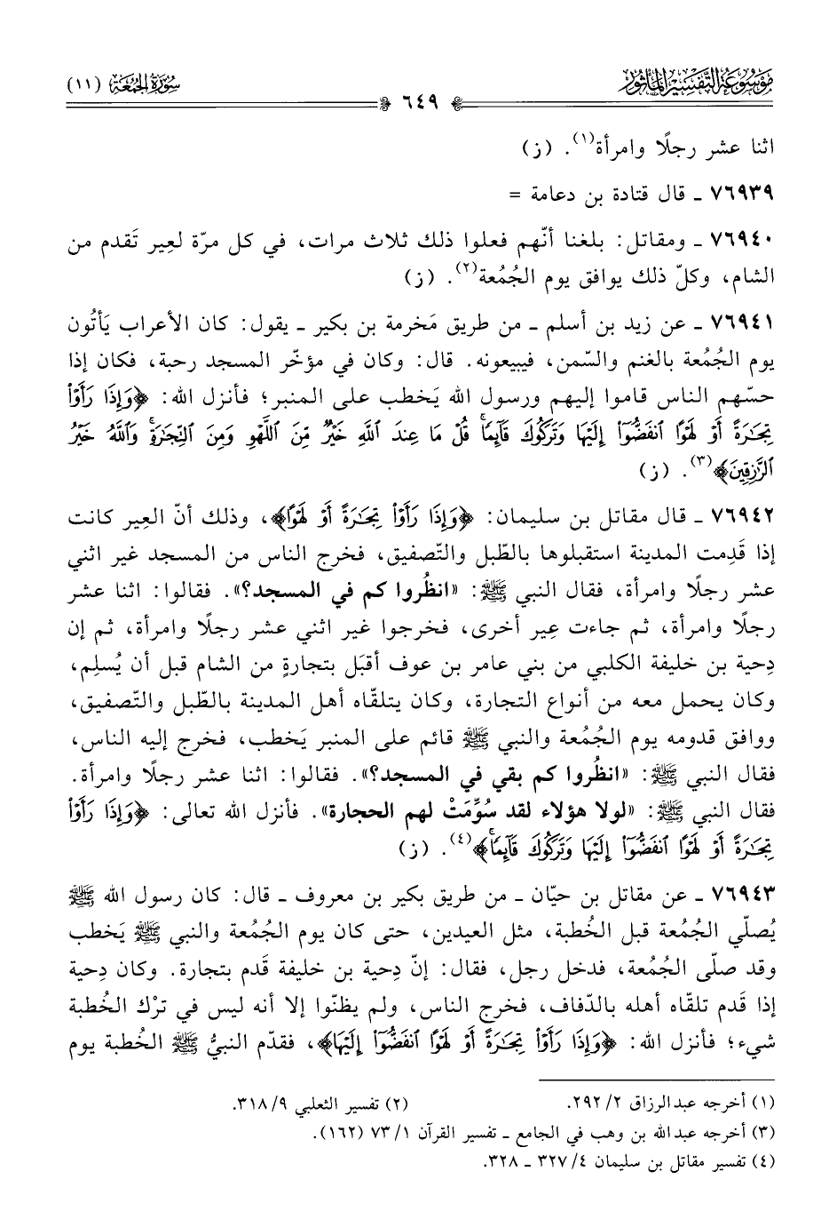٧٦٩٤٠ - ومقاتل: بلغنا أنّهم فعلوا ذلك ثلاث مرات، في كل مرّة لعِير تَقدم من الشام، وكلّ ذلك يوافق يوم الجُمُعة (¬٢). (ز)