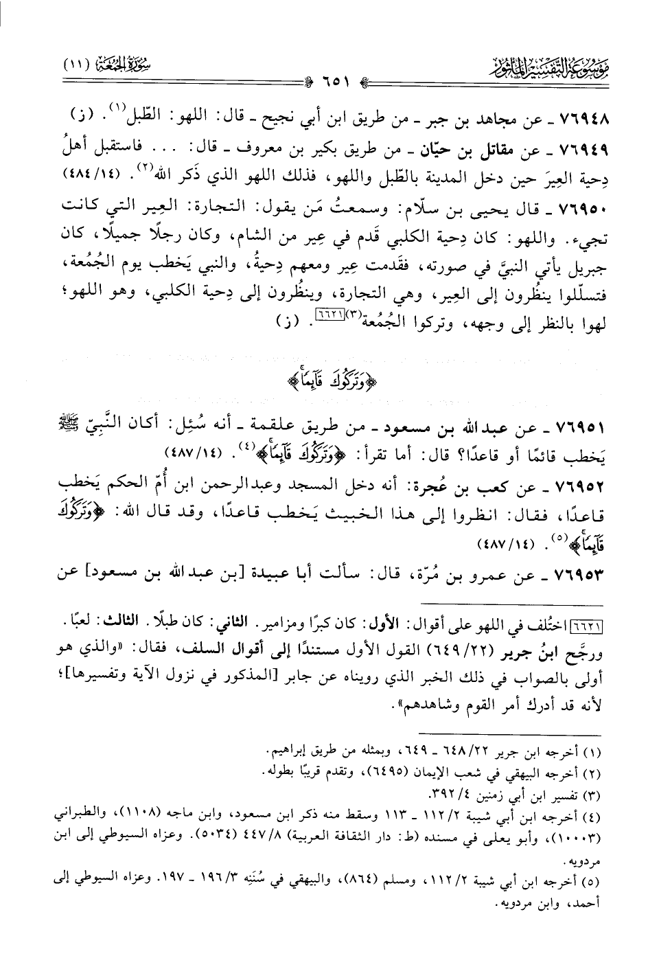 ٧٦٩٤٩ - عن مقاتل بن حيّان -من طريق بكير بن معروف- قال: ... فاستقبل أهلُ دِحية العِيرَ حين دخل المدينة بالطّبل واللهو، فذلك اللهو الذي ذَكر الله (¬٢). (١٤/ ٤٨٤)