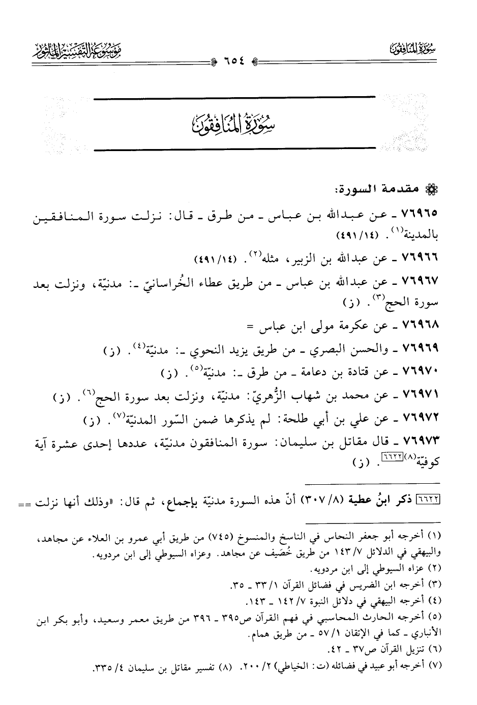 ٧٦٩٦٥ - عن عبد الله بن عباس -من طرق- قال: نزلت سورة المنافقين بالمدينة (¬١). (١٤/ ٤٩١)
