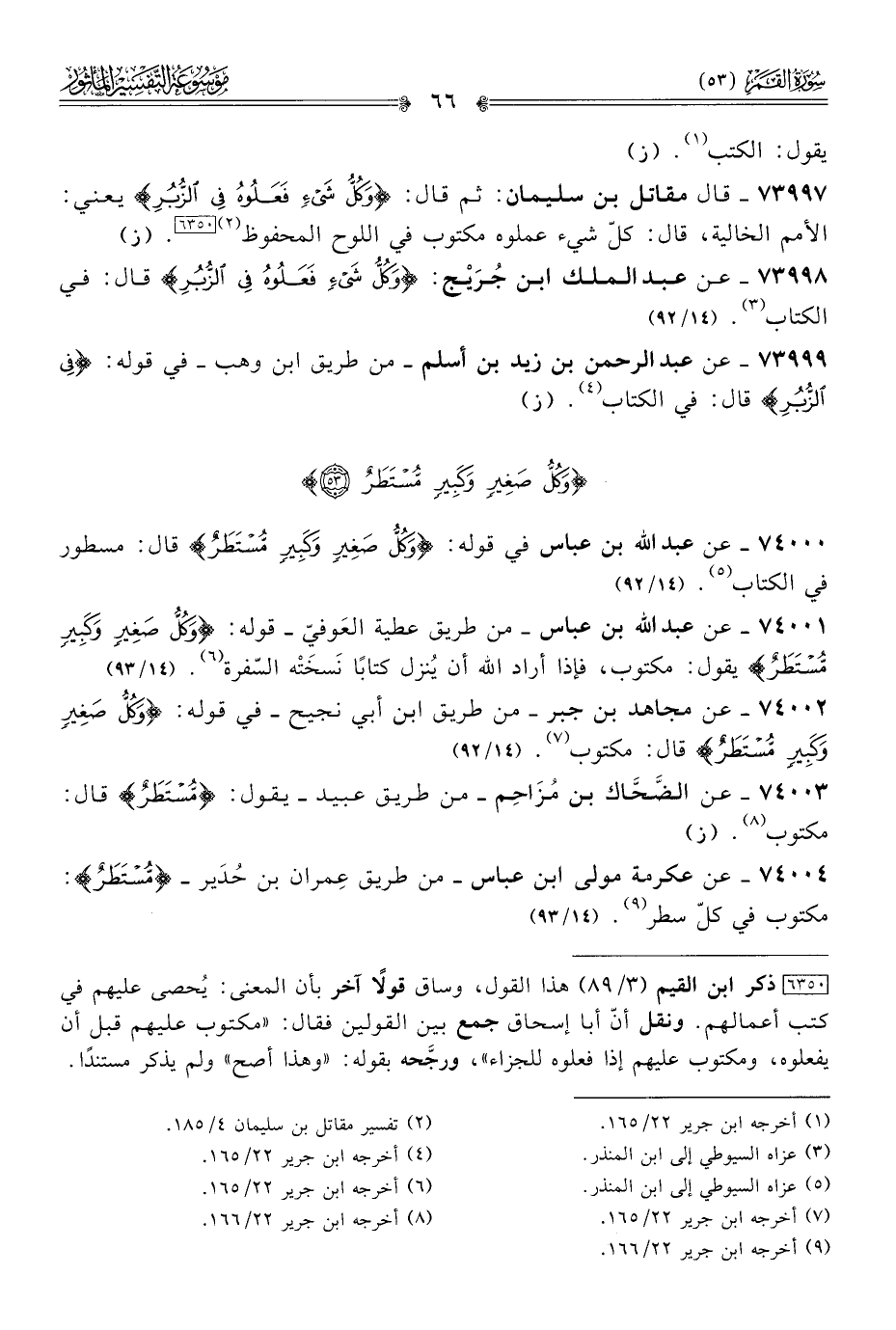 ٧٤٠٠٠ - عن عبد الله بن عباس في قوله: {وكُلُّ صَغِيرٍ وكَبِيرٍ مُسْتَطَرٌ} قال: مسطور في الكتاب (¬٥). (١٤/ ٩٢)