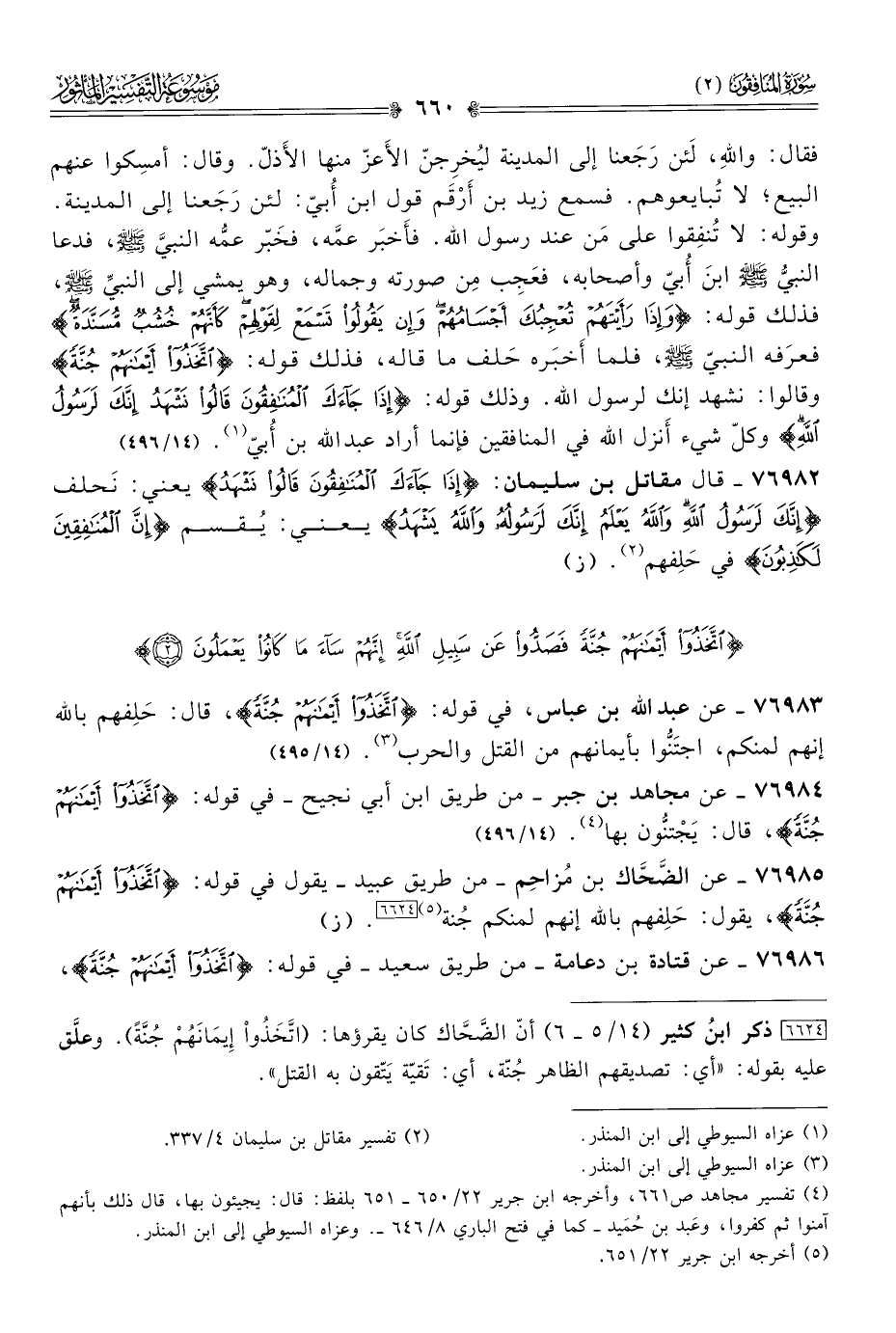٧٦٩٨٤ - عن مجاهد بن جبر -من طريق ابن أبي نجيح- في قوله: {اتَّخَذُوا أيْمانَهُمْ جُنَّةً}، قال: يَجْتنُّون بها (¬٤).