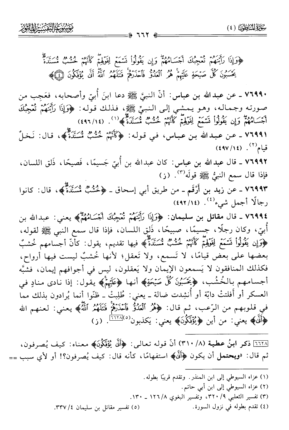 ٧٦٩٩٣ - عن زيد بن أرْقَم -من طريق أبي إسحاق- {خُشُبٌ مُسَنَّدَةٌ}، قال: كانوا رجالًا أجمل شيء (¬٤). (١٤/ ٤٩٢)