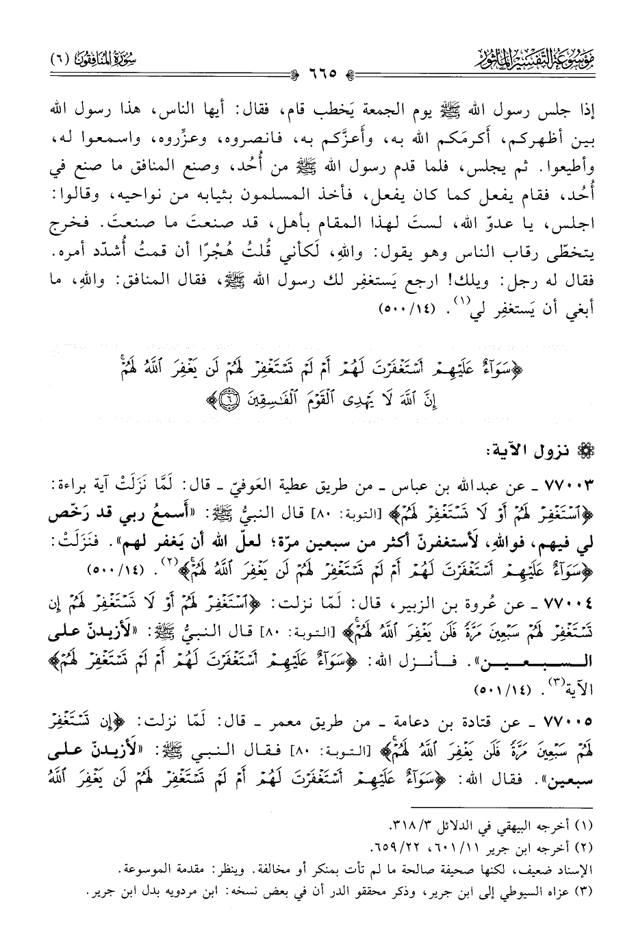 ٧٧٠٠٣ - عن عبد الله بن عباس -من طريق عطية العَوفيّ- قال: لَمّا نَزَلَتْ آية براءة: {اسْتَغْفِرْ لَهُمْ أوْ لا تَسْتَغْفِرْ لَهُمْ} [التوبة: ٨٠] قال النبيُّ - صلى الله عليه وسلم -: «أسمعُ ربي قد رَخّص لي فيهم، فواللهِ، لَأستغفرنّ أكثر من سبعين مرّة؛ لعلّ الله أن يَغفر لهم». فنَزَلَتْ: {سَواءٌ عَلَيْهِمْ أسْتَغْفَرْتَ لَهُمْ أمْ لَمْ تَسْتَغْفِرْ لَهُمْ لَنْ يَغْفِرَ اللَّهُ لَهُمْ} (¬٢). (١٤/ ٥٠٠)