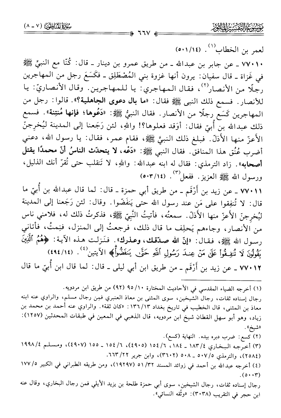 ٧٧٠١١ - عن زيد بن أرْقَم -من طريق أبي حمزة- قال: لما قال عبد الله بن أُبيّ ما قال: لا تُنفِقوا على مَن عند رسول الله حتى يَنفَضّوا. وقال: لئن رَجَعنا إلى المدينة ليُخرِجنّ الأَعزّ منها الأَذلّ. سمعتُه، فأتيتُ النَّبِيّ - صلى الله عليه وسلم -، فذكرتُ ذلك له، فلامني ناس من الأنصار، وجاءهم يَحلِف ما قال ذلك، فرجعتُ إلى المنزل، فنِمتُ، فأتاني رسول الله - صلى الله عليه وسلم -، فقال: «إنّ الله صدّقك، وعذرك». فنَزلت هذه الآية: {هُمُ الَّذِينَ يَقُولُونَ لا تُنْفِقُوا عَلى مَن عِنْدَ رَسُولِ اللَّهِ حَتّى يَنْفَضُّوا} الآيتين (¬٤). (١٤/ ٤٩٤)