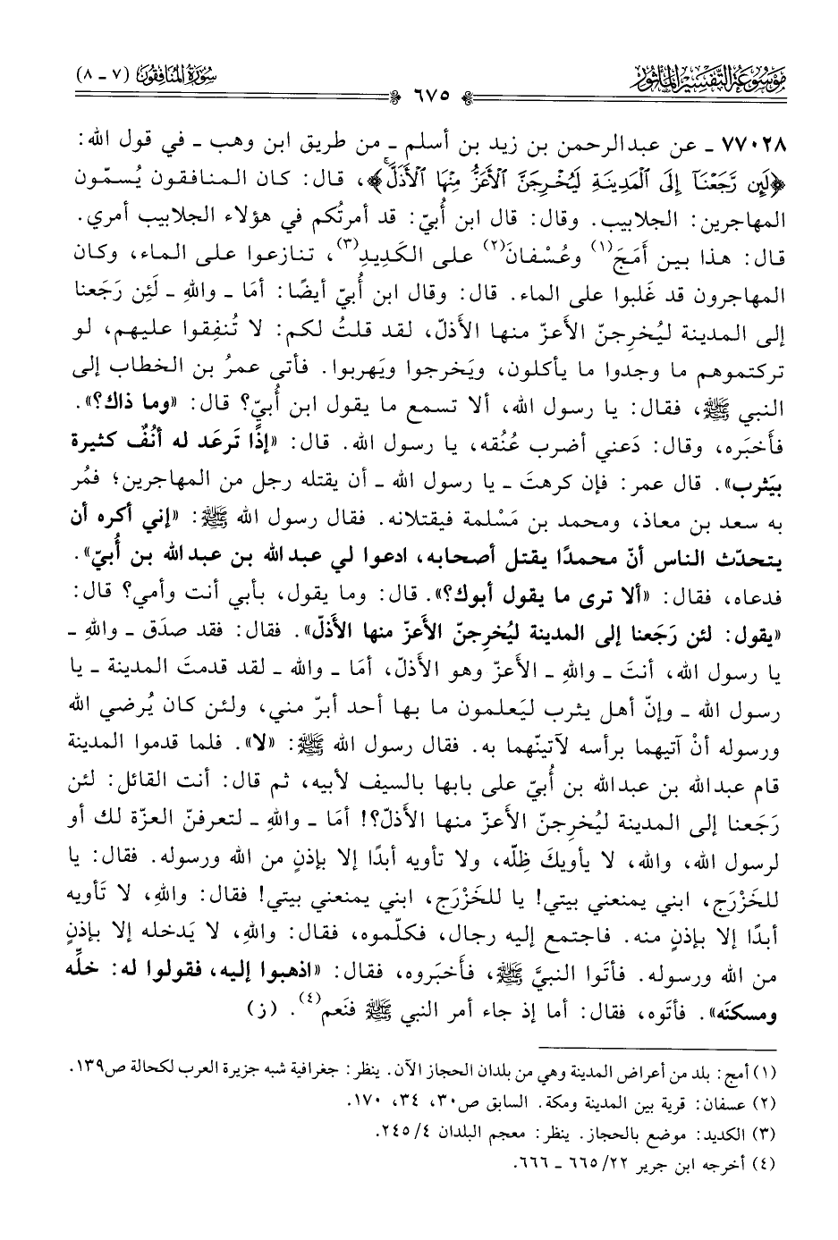 ٧٧٠٢٨ - عن عبد الرحمن بن زيد بن أسلم -من طريق ابن وهب- في قول الله: {لَئِنْ رَجَعْنا إلى المَدِينَةِ لَيُخْرِجَنَّ الأَعَزُّ مِنها الأَذَلَّ}، قال: كان المنافقون يُسمّون المهاجرين: الجلابيب. وقال: قال ابن أُبيّ: قد أمرتُكم في هؤلاء الجلابيب أمري. قال: هذا بين أمَجَ (¬١) وعُسْفانَ (¬٢) على الكَدِيدِ (¬٣)، تنازعوا على الماء، وكان المهاجرون قد غَلبوا على الماء. قال: وقال ابن أُبيّ أيضًا: أما -واللهِ- لَئِن رَجَعنا إلى المدينة ليُخرِجنّ الأَعزّ منها الأَذلّ، لقد قلتُ لكم: لا تُنفِقوا عليهم، لو تركتموهم ما وجدوا ما يأكلون، ويَخرجوا ويَهربوا. فأتى عمرُ بن الخطاب إلى النبي - صلى الله عليه وسلم -، فقال: يا رسول الله، ألا تسمع ما يقول ابن أُبيّ؟ قال: «وما ذاك؟». فأَخبَره، وقال: دَعني أضرب عُنُقه، يا رسول الله. قال: «إذًا تَرعَد له أنُفٌ كثيرة بيَثرب». قال عمر: فإن كرهتَ -يا رسول الله- أن يقتله رجل من المهاجرين؛ فمُر به سعد بن معاذ، ومحمد بن مَسْلمة فيقتلانه. فقال رسول الله - صلى الله عليه وسلم -: «إني أكره أن يتحدّث الناس أنّ محمدًا يقتل أصحابه، ادعوا لي عبد الله بن عبد الله بن أُبيّ». فدعاه، فقال: «ألا ترى ما يقول أبوك؟». قال: وما يقول، بأبي أنت وأمي؟ قال: «يقول: لئن رَجَعنا إلى المدينة ليُخرِجنّ الأَعزّ منها الأَذلّ». فقال: فقد صدَق -واللهِ- يا رسول الله، أنتَ -واللهِ- الأَعزّ وهو الأَذلّ، أما -والله- لقد قدمتَ المدينة -يا رسول الله- وإنّ أهل يثرب ليَعلمون ما بها أحد أبرّ مني، ولئن كان يُرضي الله ورسوله أنْ آتيهما برأسه لآتينّهما به. فقال رسول الله - صلى الله عليه وسلم -: «لا». فلما قدموا المدينة قام عبد الله بن عبد الله بن أُبيّ على بابها بالسيف لأبيه، ثم قال: أنت القائل: لئن رَجَعنا إلى المدينة ليُخرِجنّ الأَعزّ منها الأَذلّ؟! أما -واللهِ- لتعرفنّ العزّة لك أو لرسول الله، والله، لا يأويكَ ظِلّه، ولا تأويه أبدًا إلا بإذنٍ من الله ورسوله. فقال: يا للخَزْرَج، ابني يمنعني بيتي! يا للخَزْرَج، ابني يمنعني بيتي! فقال: واللهِ، لا تَأويه أبدًا إلا بإذنٍ منه. فاجتمع إليه رجال، فكلّموه، فقال: واللهِ، لا يَدخله إلا بإذنٍ من الله ورسوله. فأتَوا النبيَّ - صلى الله عليه وسلم -، فأَخبَروه، فقال: «اذهبوا إليه، فقولوا له: خلِّه ومسكنَه». فأتَوه، فقال: أما إذ جاء أمر النبي - صلى الله عليه وسلم - فنَعم (¬٤). (ز)