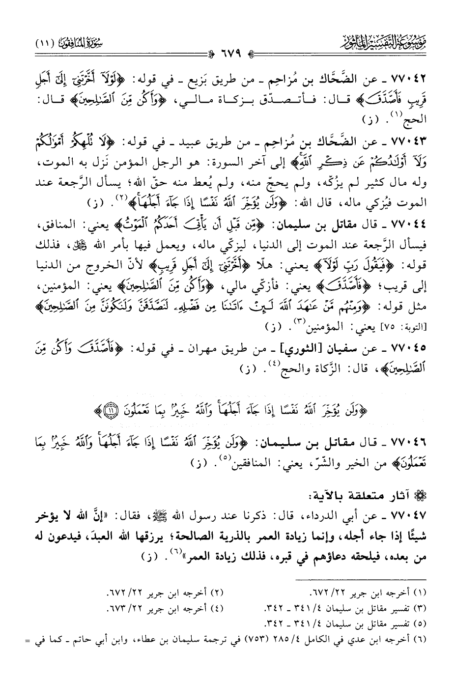 ٧٧٠٤٣ - عن الضَّحّاك بن مُزاحِم -من طريق عبيد- في قوله: {لا تُلْهِكُمْ أمْوالُكُمْ ولا أوْلادُكُمْ عَنْ ذِكْرِ اللَّهِ} إلى آخر السورة: هو الرجل المؤمن نَزل به الموت، وله مال كثير لم يزُكّه، ولم يحجّ منه، ولم يُعط منه حقّ الله؛ يسأل الرَّجعة عند الموت فيُزكي ماله، قال الله: {ولَنْ يُؤَخِّرَ اللَّهُ نَفْسًا إذا جاءَ أجَلُها} (¬٢). (ز)