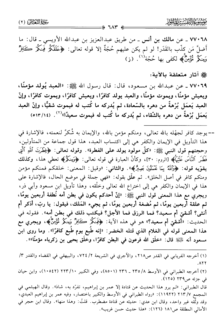 ٧٧٠٦٨ - عن مالك بن أنس -من طريق عبد العزيز بن عبد الله الأويسي- قال: ما أضلَّ مَن كذّب بالقَدَر! لو لم يكن عليهم حُجّةٌ إلا قوله تعالى: {خلقكم فمنكم كافر ومنكم مؤمن} لكفى بها حُجّة (¬١). (ز)