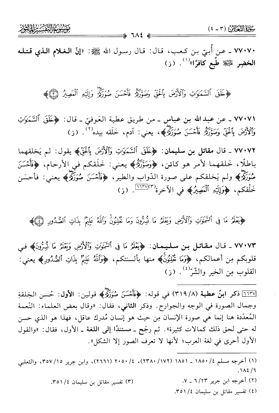 ٧٧٠٧١ - عن عبد الله بن عباس -من طريق عطية العَوفيّ- قال: {خَلَقَ السَّماواتِ والأَرْضَ بِالحَقِّ وصَوَّرَكُمْ فَأَحْسَنَ صُوَرَكُمْ}، يعني: آدم، خَلَقه بيده (¬٢). (ز)