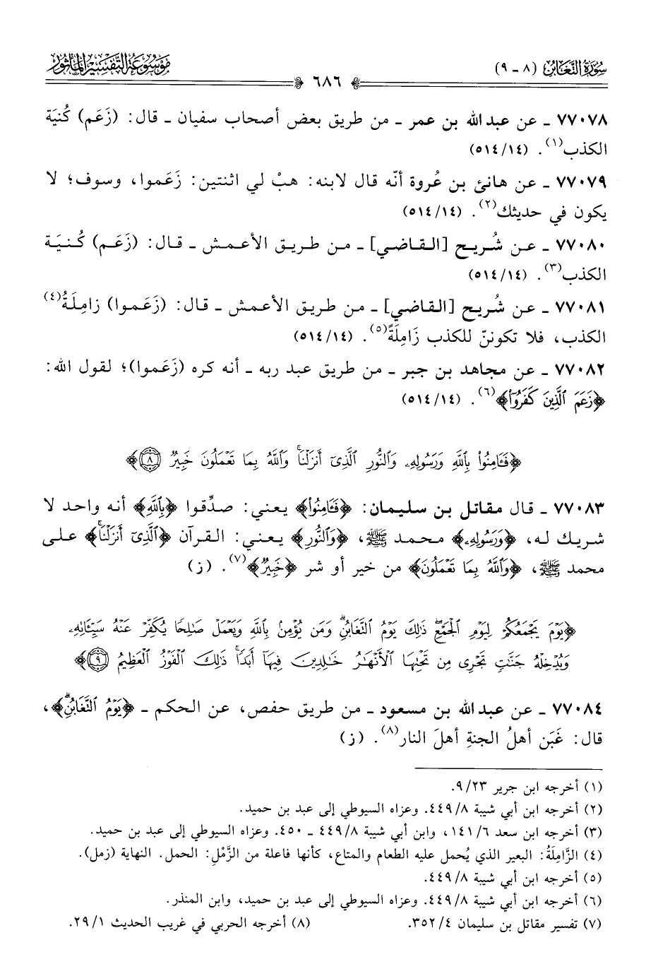 ٧٧٠٨٢ - عن مجاهد بن جبر -من طريق عبد ربه- أنه كره (زَعَموا)؛ لقول الله: {زَعَمَ الَّذِينَ كَفَرُوا} (¬٦). (١٤/ ٥١٤)