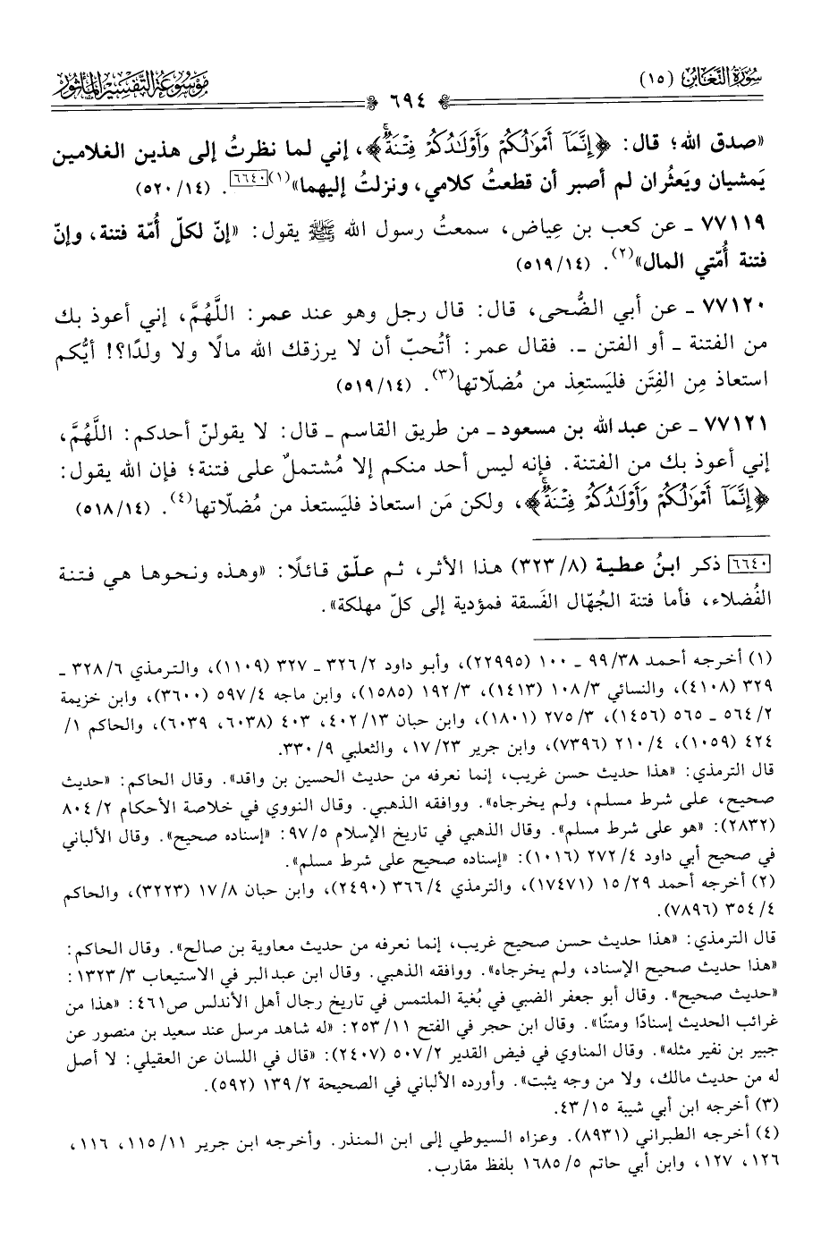 ٧٧١١٩ - عن كعب بن عِياض، سمعتُ رسول الله - صلى الله عليه وسلم - يقول: «إنّ لكلّ أُمّة فتنة، وإنّ فتنة أُمّتي المال» (¬٢). (١٤/ ٥١٩)