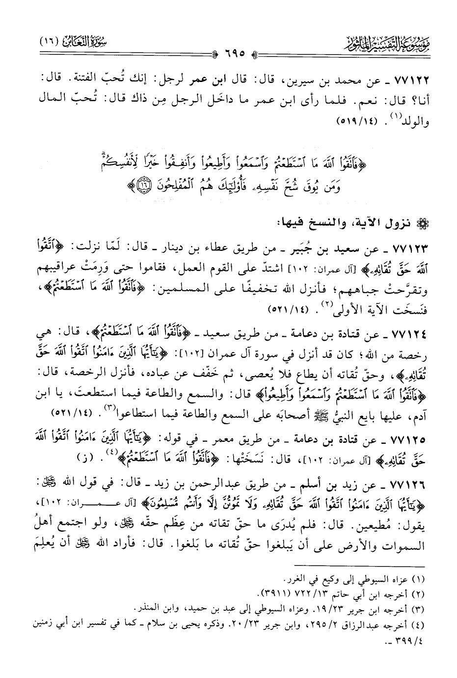 ٧٧١٢٣ - عن سعيد بن جُبَير -من طريق عطاء بن دينار- قال: لَمّا نزلت: {اتَّقُوا اللَّهَ حَقَّ تُقاتِهِ} [آل عمران: ١٠٢] اشتدّ على القوم العمل، فقاموا حتى ورِمَتْ عراقيبهم وتقرَّحتْ جباههم؛ فأنزل الله تخفيفًا على المسلمين: {فاتَّقُوا اللَّهَ ما اسْتَطَعْتُمْ}، فنَسخَت الآية الأولى (¬٢). (١٤/ ٥٢١)