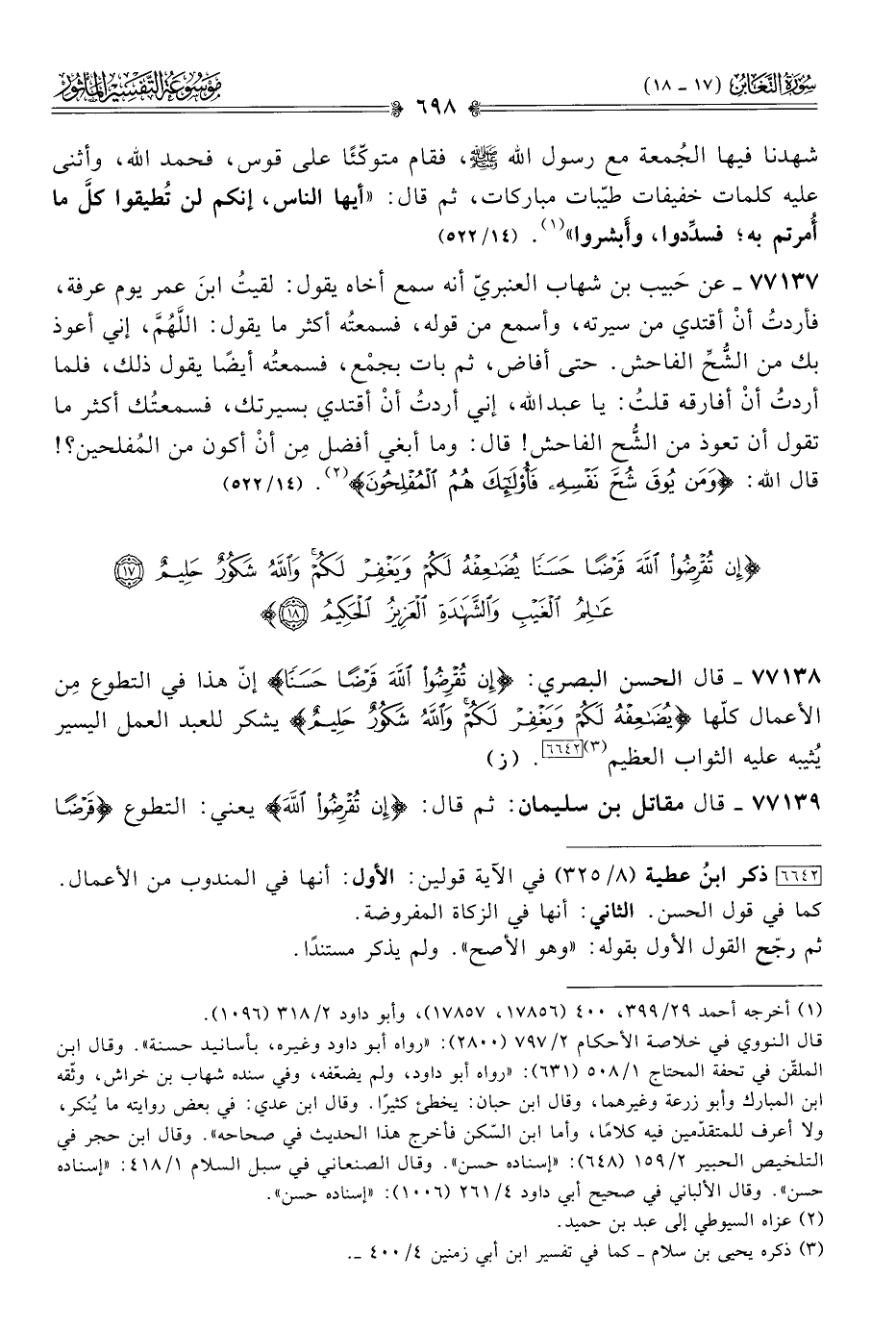 ٧٧١٣٨ - قال الحسن البصري: {إنْ تُقْرِضُوا اللَّهَ قَرْضًا حَسَنًا} إنّ هذا في التطوع مِن الأعمال كلّها {يُضاعِفْهُ لَكُمْ ويَغْفِرْ لَكُمْ واللَّهُ شَكُورٌ حَلِيمٌ} يشكر للعبد العمل اليسير يُثيبه عليه الثواب العظيم (¬٣) [٦٦٤٢]. (ز)
