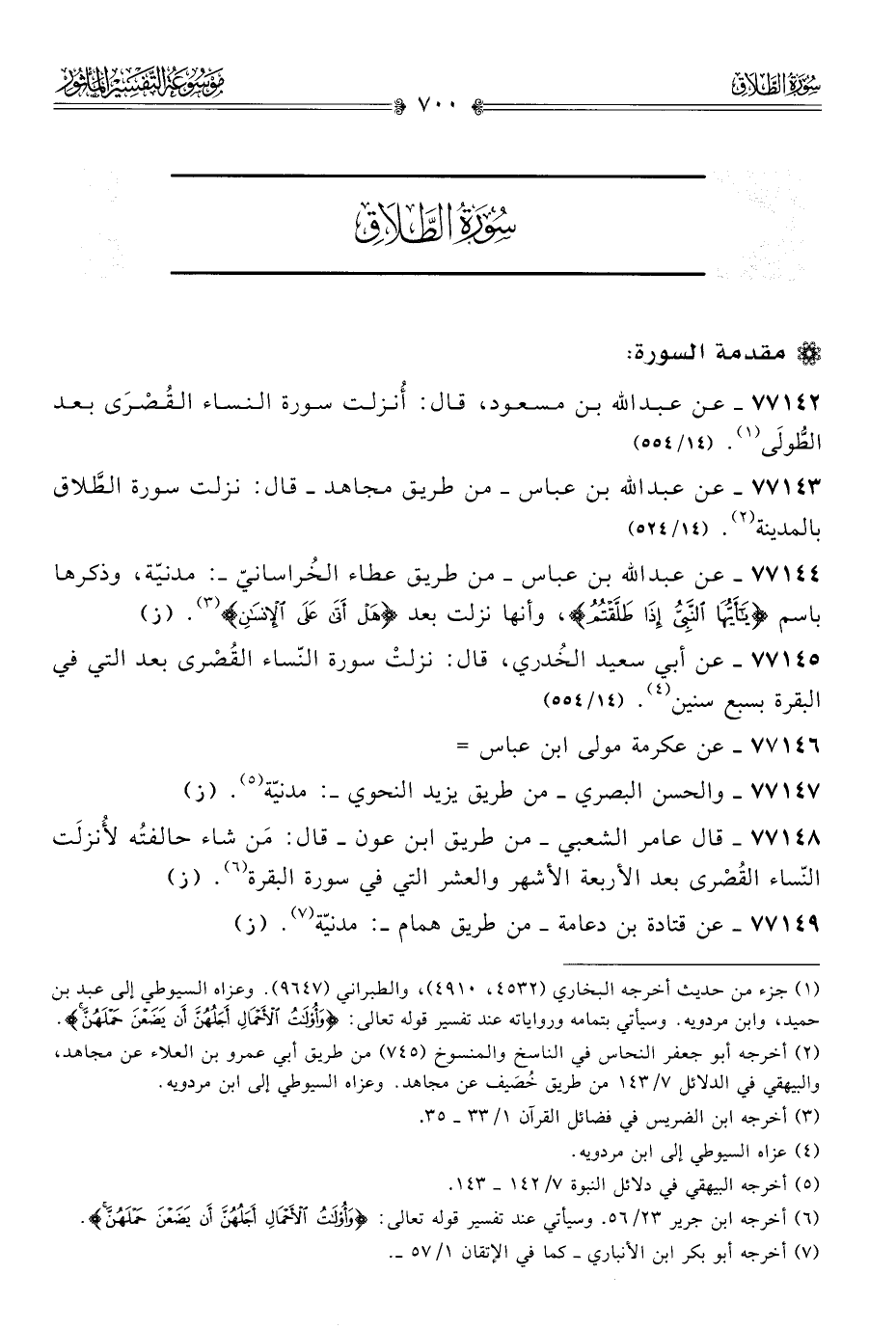 ٧٧١٤٤ - عن عبد الله بن عباس -من طريق عطاء الخُراسانيّ-: مدنيّة، وذكرها بمسمّى {يا أيها النبي إذا طَلَّقْتُم}، وأنها نزلت بعد {هل أتى على الإنسان} (¬٣). (ز)