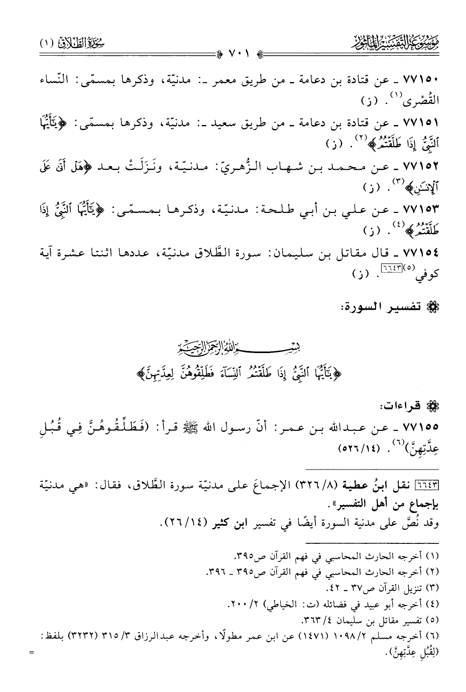 ٧٧١٥٣ - عن علي بن أبي طلحة: مدنيّة، وذكرها بمسمّى: {يا أيها النبي إذا طَلَّقْتُم} (¬٤). (ز)