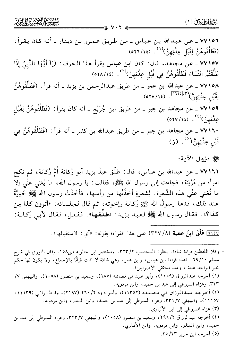 ٧٧١٥٨ - عن عبد الله بن عمر -من طريق عبد الرحمن بن يزيد- أنه قرأ: (فَطَلِّقُوهُنَّ لِقُبُلِ عِدَّتِهِنَّ) (¬٣) [٦٦٤٤]. (١٤/ ٥٢٧)