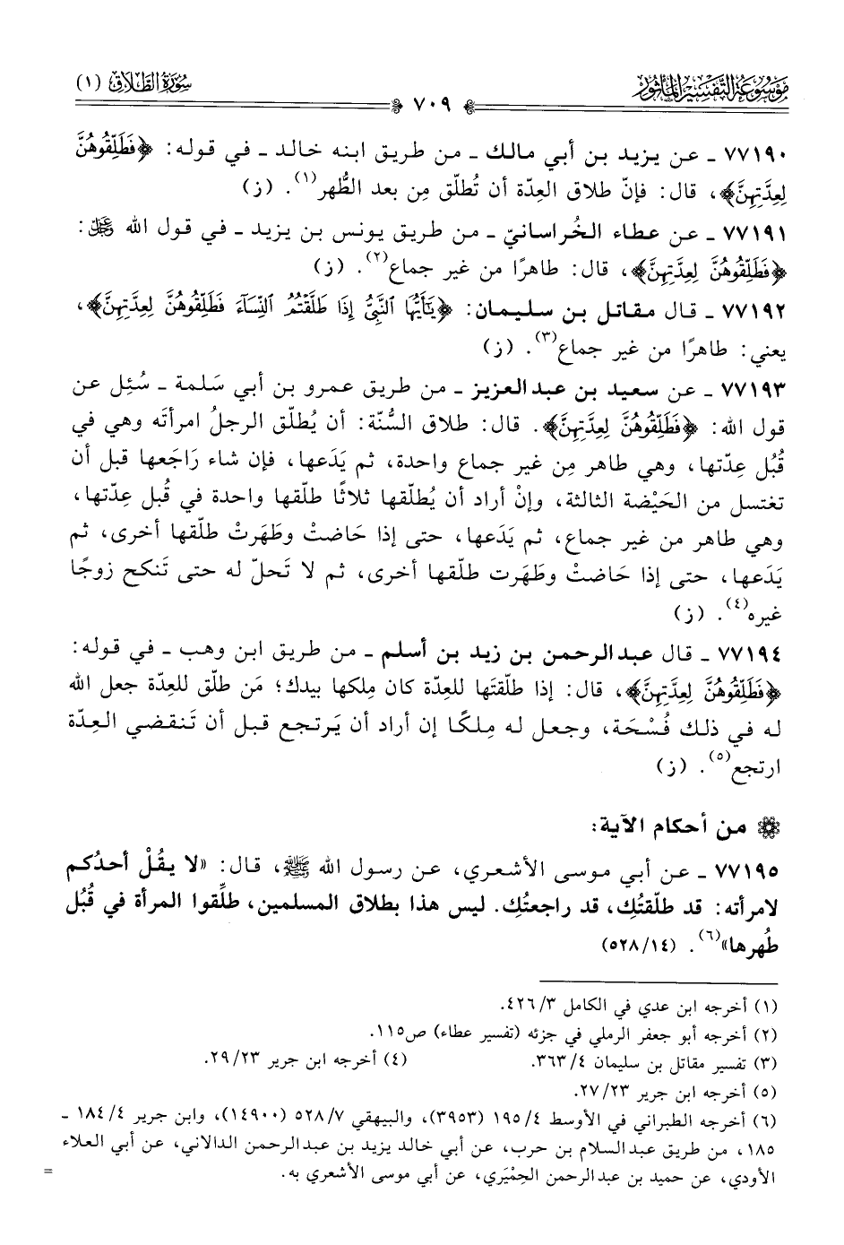 ٧٧١٩٣ - عن سعيد بن عبد العزيز -من طريق عمرو بن أبي سَلمة- سُئِل عن قول الله: {فَطَلِّقُوهُنَّ لِعِدَّتِهِنَّ}. قال: طلاق السُّنّة: أن يُطلّق الرجلُ امرأتَه وهي في قُبُل عِدّتها، وهي طاهر مِن غير جماع واحدة، ثم يَدَعها، فإن شاء راجَعها قبل أن تغتسل من الحَيْضة الثالثة، وإنْ أراد أن يُطلّقها ثلاثًا طلّقها واحدة في قُبل عِدّتها، وهي طاهر من غير جماع، ثم يَدَعها، حتى إذا حاضتْ وطَهَرتْ طلّقها أخرى، ثم يَدَعها، حتى إذا حاضتْ وطَهَرت طلّقها أخرى، ثم لا تَحلّ له حتى تَنكح زوجًا غيره (¬٤). (ز)