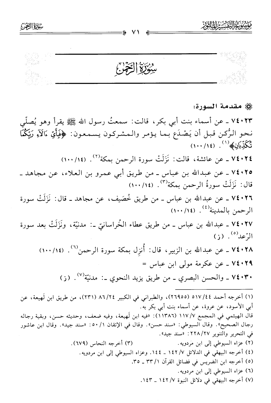 ٧٤٠٢٤ - عن عائشة، قالت: نَزَلَتْ سورة الرحمن بمكة (¬٢). (١٤/ ١٠٠)
