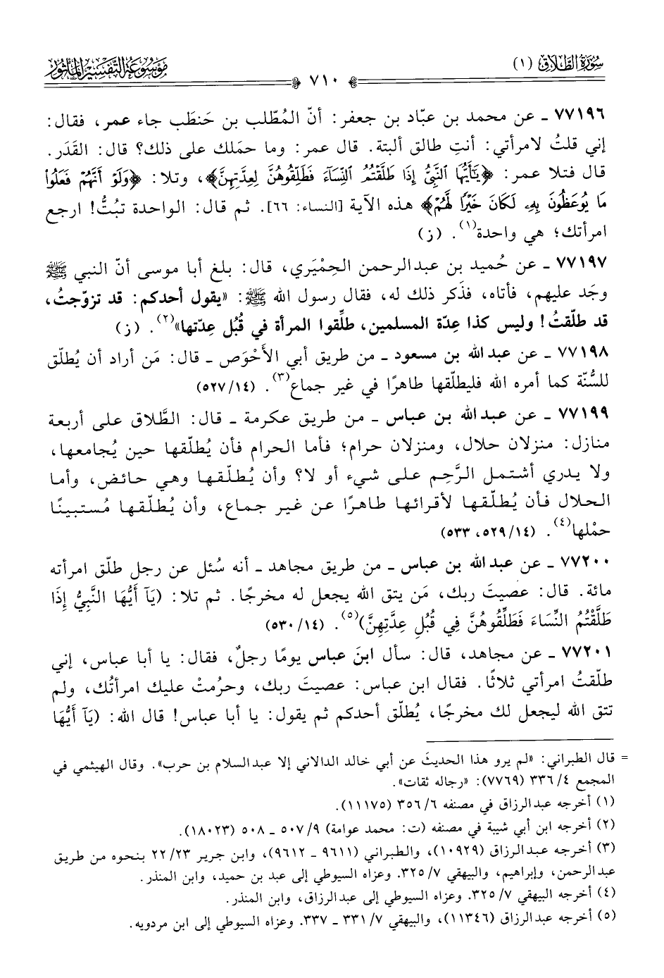 ٧٧١٩٩ - عن عبد الله بن عباس -من طريق عكرمة- قال: الطَّلاق على أربعة منازل: منزلان حلال، ومنزلان حرام؛ فأما الحرام فأن يُطلّقها حين يُجامعها، ولا يدري أشتمل الرَّحِم على شيء أو لا؟ وأن يُطلّقها وهي حائض، وأما الحلال فأن يُطلّقها لأقرائها طاهرًا عن غير جماع، وأن يُطلّقها مُستبينًا حمْلها (¬٤). (١٤/ ٥٢٩، ٥٣٣)
