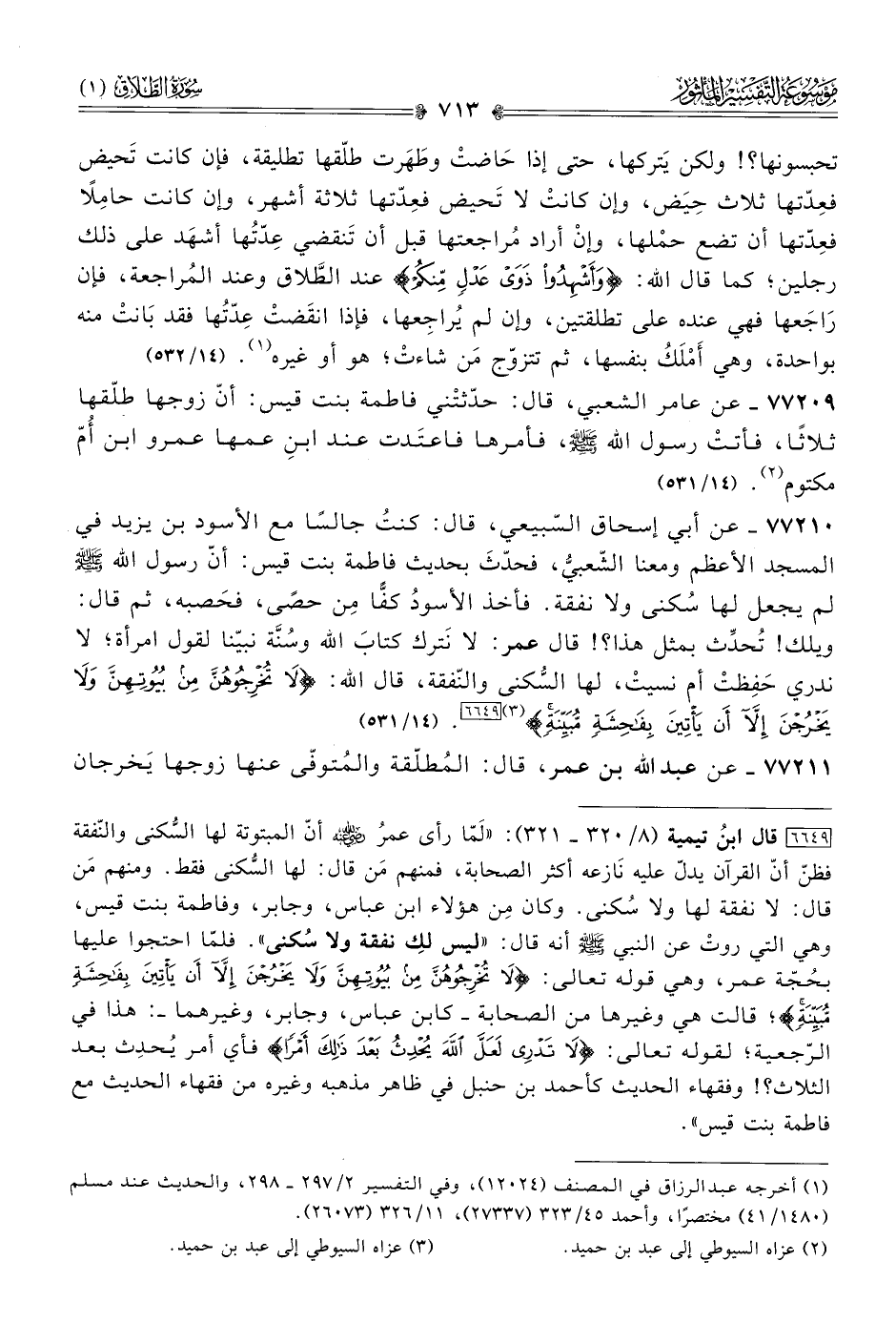 ٧٧٢١٠ - عن أبي إسحاق السّبيعي، قال: كنتُ جالسًا مع الأسود بن يزيد في المسجد الأعظم ومعنا الشّعبيُّ، فحدّثَ بحديث فاطمة بنت قيس: أنّ رسول الله - صلى الله عليه وسلم - لم يجعل لها سُكنى ولا نفقة. فأخذ الأسودُ كفًّا مِن حصًى، فحَصبه، ثم قال: ويلك! تُحدِّث بمثل هذا؟! قال عمر: لا نَترك كتابَ الله وسنّة نبيّنا لقول امرأة؛ لا ندري حَفِظتْ أم نسيتْ، لها السُّكنى والنّفقة، قال الله: {لا تُخْرِجُوهُنَّ مِن بُيُوتِهِنَّ ولا يَخْرُجْنَ إلّا أنْ يَأْتِينَ بِفاحِشَةٍ مُبَيِّنَةٍ} (¬٣) [٦٦٤٩]. (١٤/ ٥٣١)