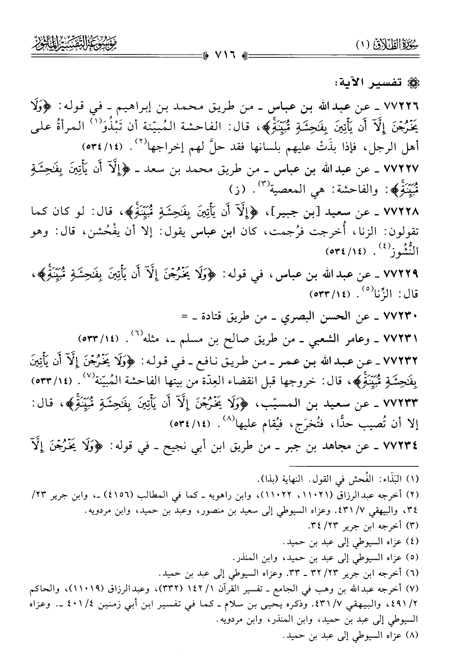 ٧٧٢٣٢ - عن عبد الله بن عمر -من طريق نافع- في قوله: {ولا يَخْرُجْنَ إلّا أنْ يَأْتِينَ بِفاحِشَةٍ مُبَيِّنَةٍ}، قال: خروجها قبل انقضاء العِدّة من بيتها الفاحشة المُبيّنة (¬٧). (١٤/ ٥٣٣)