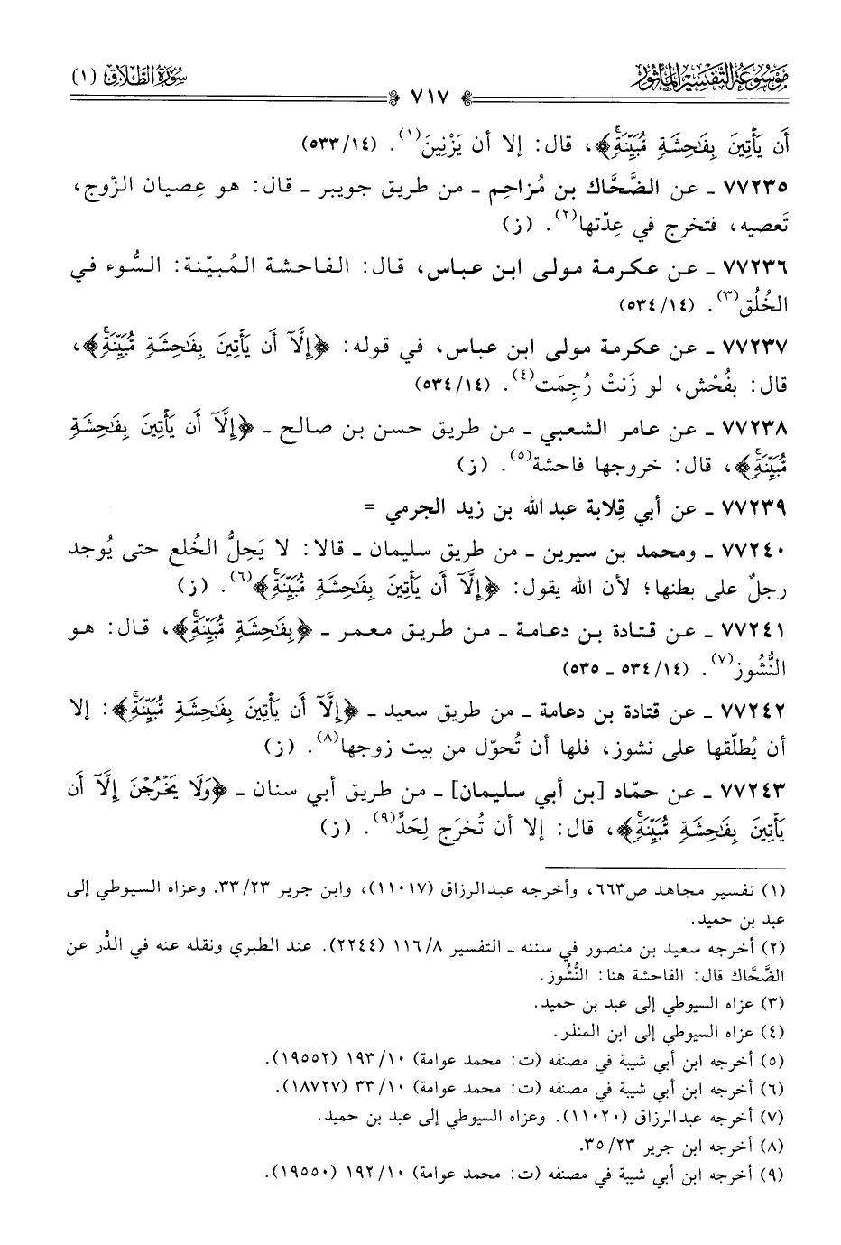 ٧٧٢٣٨ - عن عامر الشعبي -من طريق حسن بن صالح- {إلّا أنْ يَأْتِينَ بِفاحِشَةٍ مُبَيِّنَةٍ}، قال: خروجها فاحشة (¬٥). (ز)