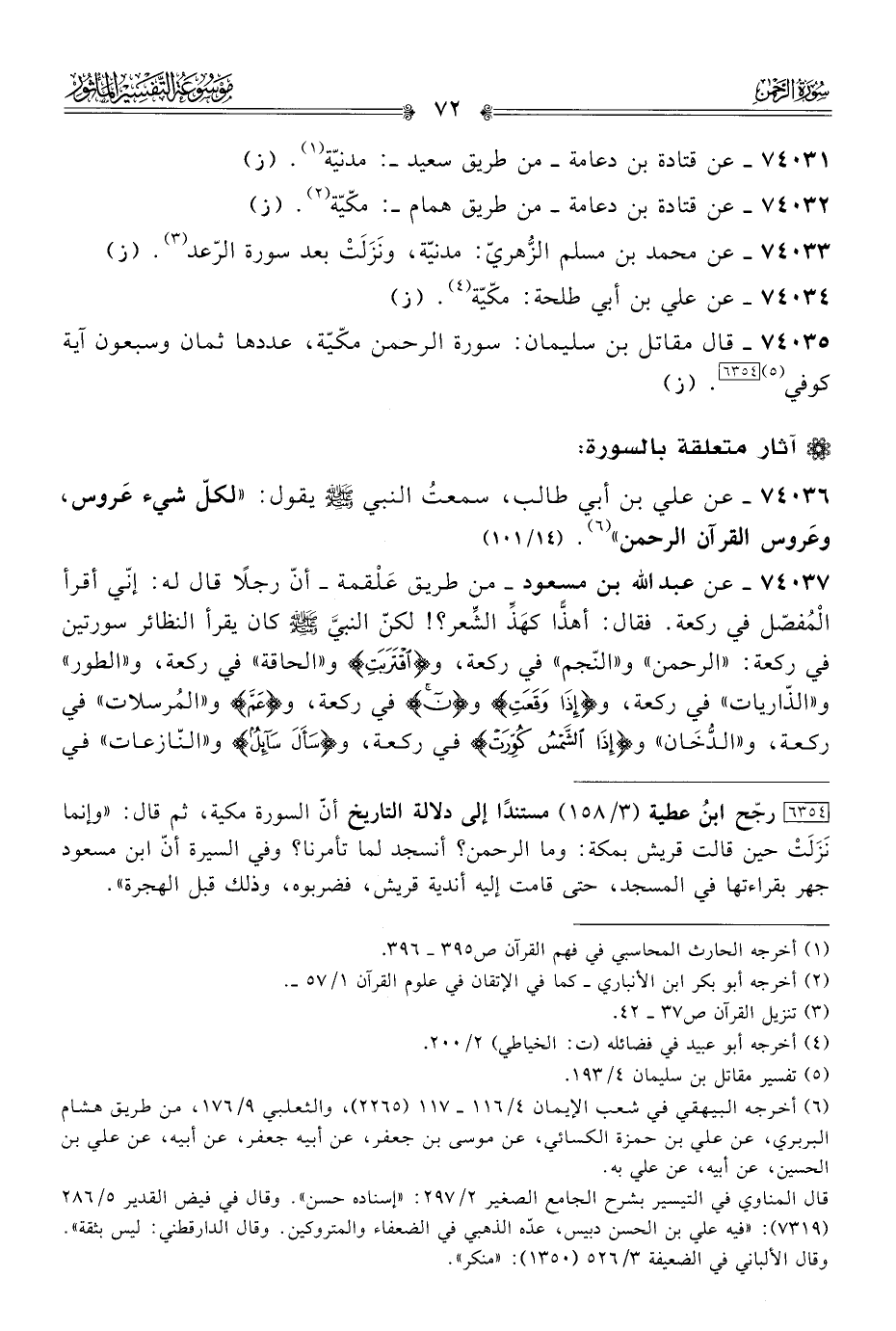 ٧٤٠٣٥ - قال مقاتل بن سليمان: سورة الرحمن مكّيّة، عددها ثمان وسبعون آية كوفي (¬٥) [٦٣٥٤]. (ز)