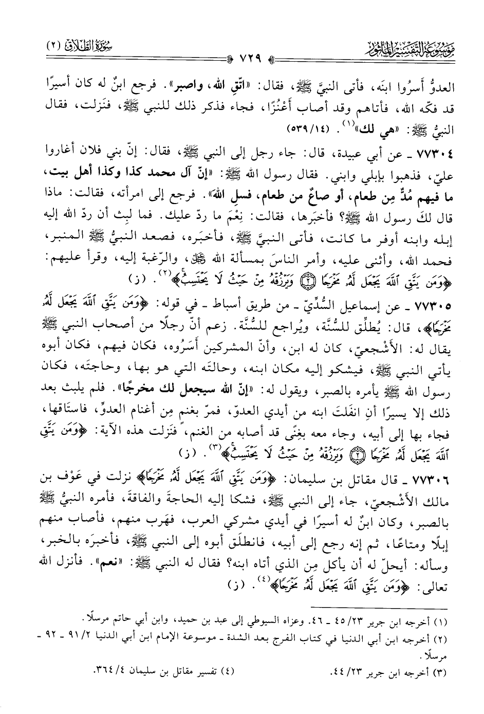 ٧٧٣٠٦ - قال مقاتل بن سليمان: {ومَن يَتَّقِ اللَّهَ يَجْعَلْ لَهُ مَخْرَجًا} نزلت في عَوْف بن مالك الأَشْجعيّ، جاء إلى النبي - صلى الله عليه وسلم -، فشكا إليه الحاجةَ والفاقةَ، فأمره النبيُّ - صلى الله عليه وسلم - بالصبر، وكان ابنٌ له أسيرًا في أيدي مشركي العرب، فهَرب منهم، فأصاب منهم إبلًا ومتاعًا، ثم إنه رجع إلى أبيه، فانطلَق أبوه إلى النبي - صلى الله عليه وسلم -، فأخبرَه بالخبر، وسأله: أيحلّ له أن يأكل مِن الذي أتاه ابنه؟ فقال له النبي - صلى الله عليه وسلم -: «نعم». فأنزل الله تعالى: {ومَن يَتَّقِ اللَّهَ يَجْعَلْ لَهُ مَخْرَجًا} (¬٤). (ز)