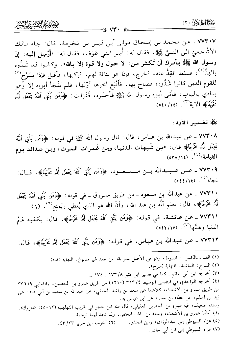 ٧٧٣٠٧ - عن محمد بن إسحاق مولى أبي قيس بن مَخرمة، قال: جاء مالك الأَشْجعيّ إلى النبيِّ - صلى الله عليه وسلم -، فقال له: أُسِر ابني عَوْف، فقال له: «أرْسِل إليه: إنّ رسول الله - صلى الله عليه وسلم - يأمرك أن تُكثر مِن: لا حول ولا قوة إلا بالله». وكانوا قد شَدُّوه بالقِدِّ (¬١)، فسقط القِدُّ عنه، فخرج، فإذا هو بناقة لهم، فرَكبها، فأقبل فإذا بسَرْحٍ (¬٢) للقوم الذين كانوا شَدُّوه، فصاح بها، فأَتْبَع آخرها أوّلها، فلم يَفْجَأ أبويه إلا وهو ينادي بالباب، فأتى أبوه رسول الله - صلى الله عليه وسلم - فأخبَره، فَنَزلت: {ومَن يَتَّقِ اللَّهَ يَجْعَلْ لَهُ مَخْرَجًا} الآية (¬٣). (١٤/ ٥٤٠)