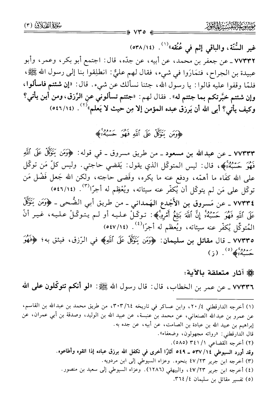 ٧٧٣٣٣ - عن عبد الله بن مسعود -من طريق مسروق- قي قوله: {ومَن يَتَوَكَّلْ عَلى اللَّهِ فَهُوَ حَسْبُهُ}، قال: ليس المتوكّل الذي يقول: يَقضي حاجتي. وليس كلّ مَن توكّل على الله كفاه ما أهمّه، ودفع عنه ما يكره، وقَضى حاجته، ولكن الله جَعل فَضْل مَن توكّل على مَن لم يتوكّل أن يُكفّر عنه سيئاته، ويُعْظِم له أجرًا (¬٣). (١٤/ ٥٤٧)