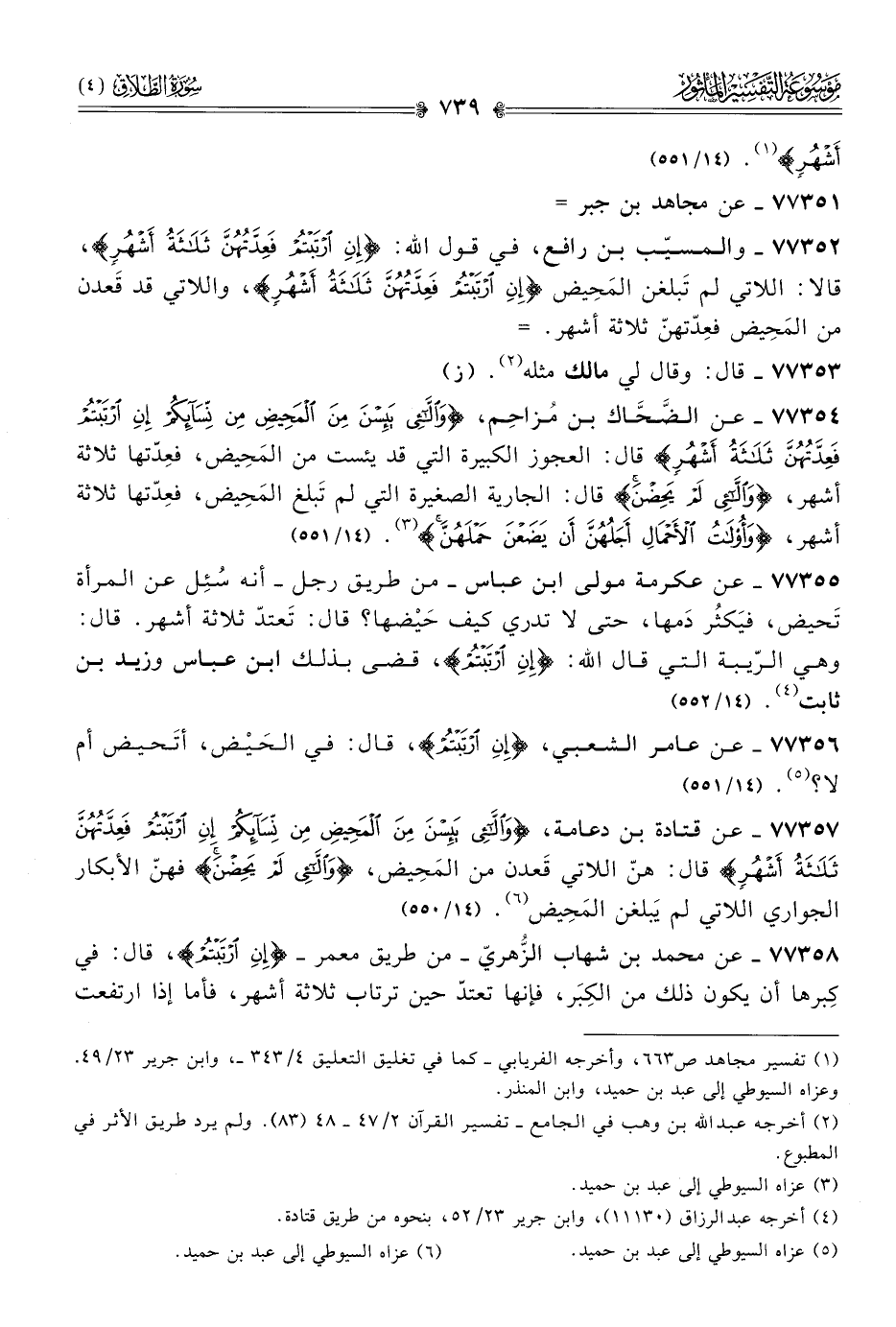 ٧٧٣٥٧ - عن قتادة بن دعامة، {واللّائِي يَئِسْنَ مِنَ المَحِيضِ مِن نِسائِكُمْ إنِ ارْتَبْتُمْ فَعِدَّتُهُنَّ ثَلاثَةُ أشْهُرٍ} قال: هنّ اللاتي قَعدن من المَحِيض، {واللّائِي لَمْ يَحِضْنَ} فهنّ الأبكار الجواري اللاتي لم يَبلغن المَحِيض (¬٦). (١٤/ ٥٥٠)