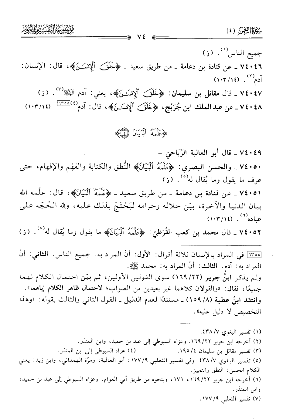 ٧٤٠٤٦ - عن قتادة بن دعامة -من طريق سعيد- {خَلَقَ الإنْسانَ}، قال: الإنسان: آدم (¬٢). (١٤/ ١٠٣)