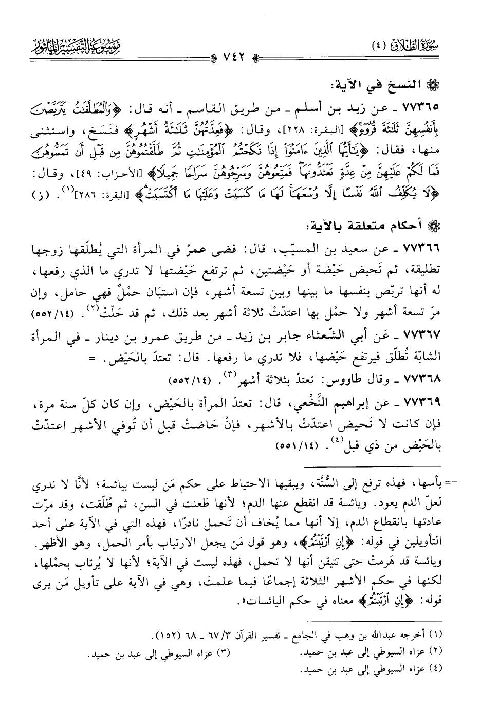 ٧٧٣٦٥ - عن زيد بن أسلم -من طريق القاسم- أنه قال: {والمُطَلَّقاتُ يَتَرَبَّصْنَ بِأَنْفُسِهِنَّ ثَلاثَةَ قُرُوءٍ} [البقرة: ٢٢٨]، وقال: {فَعِدَّتُهُنَّ ثَلاثَةُ أشْهُر} فنَسَخ، واستثنى منها، فقال: {يا أيُّها الَّذِينَ آمَنُوا إذا نَكَحْتُمُ المُؤْمِناتِ ثُمَّ طَلَّقْتُمُوهُنَّ مِن قَبْلِ أنْ تَمَسُّوهُنَّ فَما لَكُمْ عَلَيْهِنَّ مِن عِدَّةٍ تَعْتَدُّونَها فَمَتِّعُوهُنَّ وسَرِّحُوهُنَّ سَراحًا جَمِيلًا} [الأحزاب: ٤٩]، وقال: {لا يُكَلِّفُ اللَّهُ نَفْسًا إلّا وُسْعَها لَها ما كَسَبَتْ وعَلَيْها ما اكْتَسَبَتْ} [البقرة: ٢٨٦] (¬١). (ز)