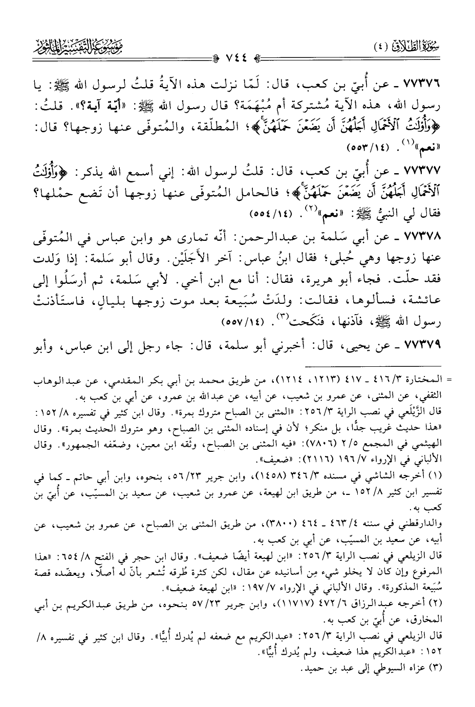 ٧٧٣٧٧ - عن أُبيّ بن كعب، قال: قلتُ لرسول الله: إني أسمع الله يذكر: {وأُولاتُ الأَحْمالِ أجَلُهُنَّ أنْ يَضَعْنَ حَمْلَهُنَّ}؛ فالحامل المُتوفّى عنها زوجها أن تَضع حمْلها؟ فقال لي النبيُّ - صلى الله عليه وسلم -: «نعم» (¬٢). (١٤/ ٥٥٤)