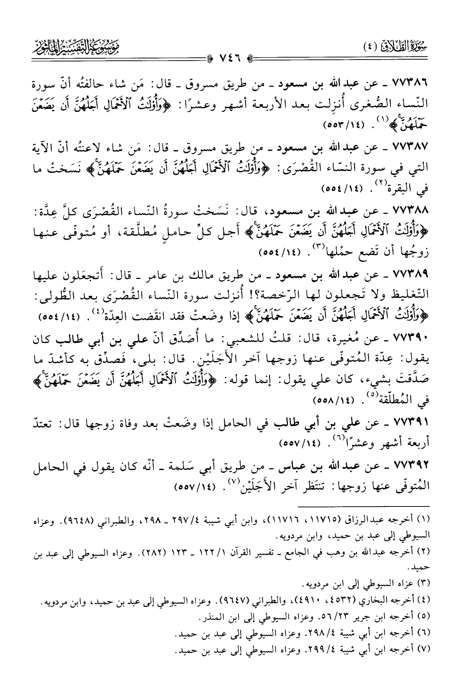٧٧٣٨٩ - عن عبد الله بن مسعود -من طريق مالك بن عامر- قال: أتجعَلون عليها التّغليظ ولا تَجعلون لها الرّخصة؟! أُنزلت سورة النّساء القُصْرى بعد الطُّولى: {وأُولاتُ الأَحْمالِ أجَلُهُنَّ أنْ يَضَعْنَ حَمْلَهُنَّ} إذا وضَعتْ فقد انقَضت العِدّة (¬٤). (١٤/ ٥٥٤)