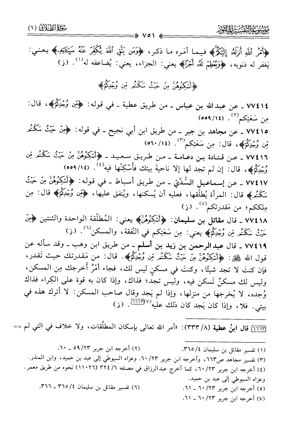 ٧٧٤١٨ - قال مقاتل بن سليمان: {أسْكِنُوهُنَّ} يعني: المُطلّقة الواحدة والثنتين {مِن حَيْثُ سَكَنْتُمْ مِن وُجْدِكُمْ} يعني: مِن سَعَتِكم في النّفقة، والمسكن (¬٦). (ز)