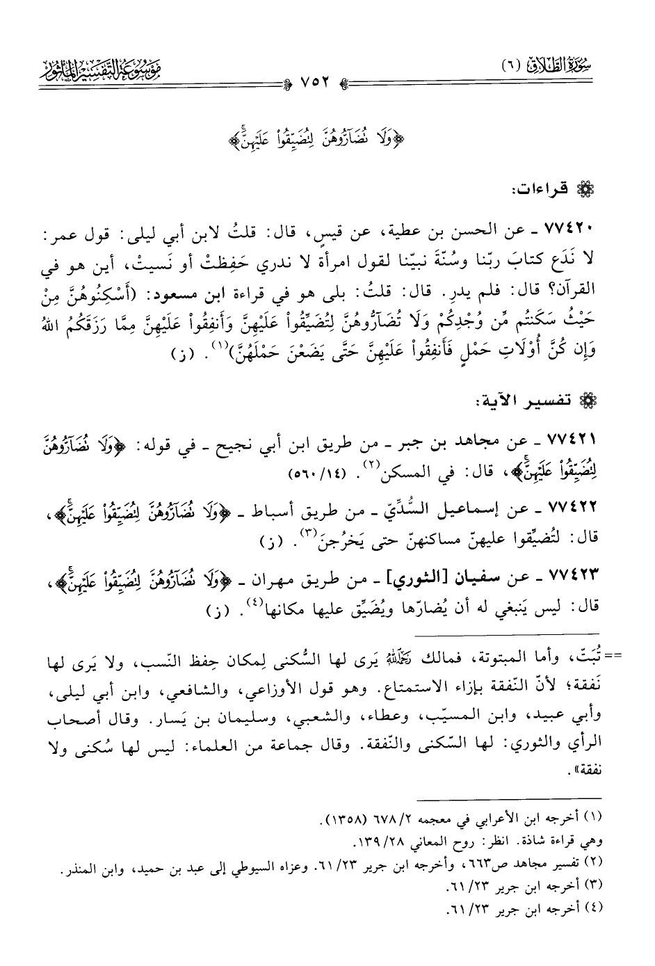 ٧٧٤٢١ - عن مجاهد بن جبر -من طريق ابن أبي نجيح- في قوله: {ولا تُضارُّوهُنَّ لِتُضَيِّقُوا عَلَيْهِنَّ}، قال: في المسكن (¬٢). (١٤/ ٥٦٠)