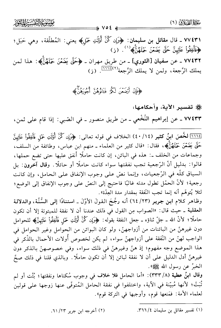 ٧٧٤٣٢ - عن سفيان [الثوري]-من طريق مهران- {حَتّى يَضَعْنَ حَمْلَهُنَّ}: هذا لمن يملك الرَّجعة، ولمن لا يملك الرَّجعة (¬٢) [٦٦٦٤]. (ز)
