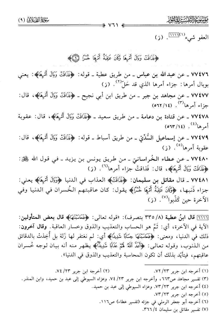 ٧٧٤٧٧ - عن مجاهد بن جبر -من طريق ابن أبي نجيح- {فَذاقَتْ وبالَ أمْرِها}، قال: جزاء أمرها (¬٣). (١٤/ ٥٦٢)